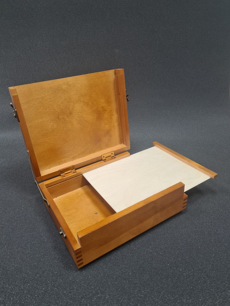 Этюдный ящик от бренда «Подольские товары для художников» произведен из березы. Благодаря компактным размерам 255х210х85 мм. этюдник удобно брать с собой в путешествия и на пленэры. Ящик надежно закрывается, обеспечивая сохранность всему содержимому. В комплекте с ящиком идет планшет из фанеры.