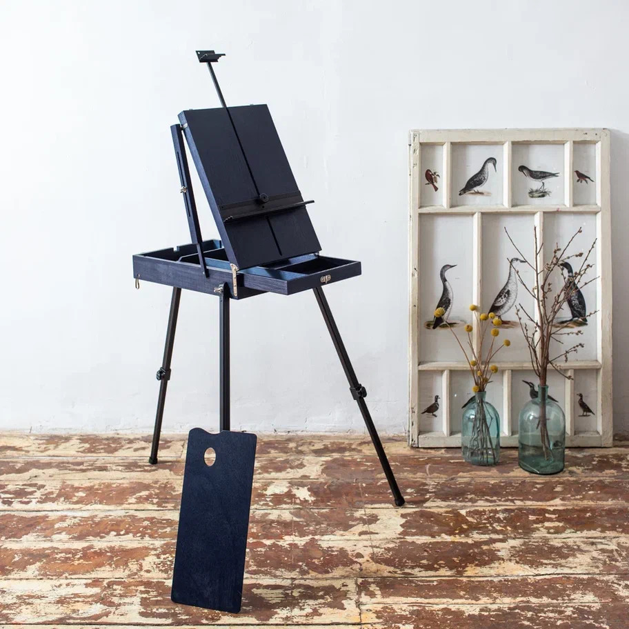 Современный стильный этюдник, который сочетает в себе два материала - дерево и металл. Ножки и держатели холста этюдника выполнены из алюминия, ящик сделан из сосны и затонирован в благородный цвет индиго. Благодаря такому сочетанию материалов этюдник получается невероятно легким, при этом его функциональность такая же, как и у более дорогих моделей из бука. В комплект входит палитра и ремешок для ношения на плече. Характеристики: Высота от 105 до 180 см; Высота от пола до ящика: от 43 до 75 см; Ширина ящика 43,5 см, длина 55 см; В сложенном виде 43,5х55х12 см; Отделения: 45х8; 20х15 (2 шт). Ширина полки 33; ширина бегунка 7,5; Глубина полки 4 см; Максимальная высота холста 82 см; Основание (ноги): 73х90; Палитра 45х20; Вес 4 кг.