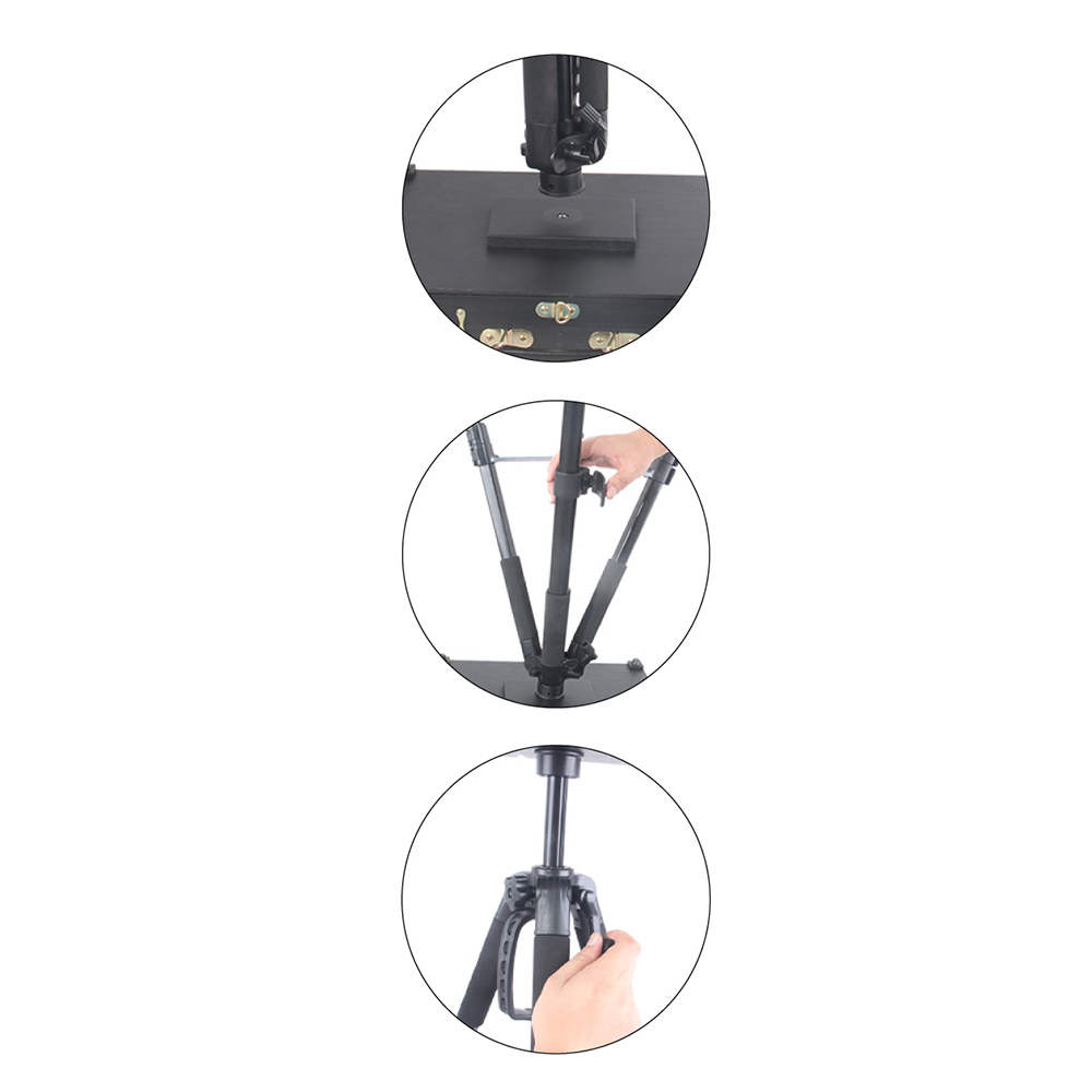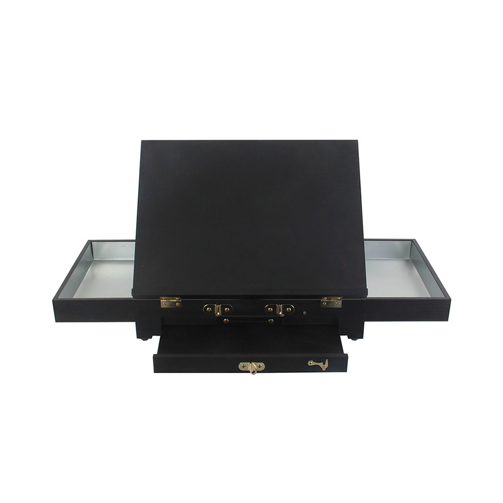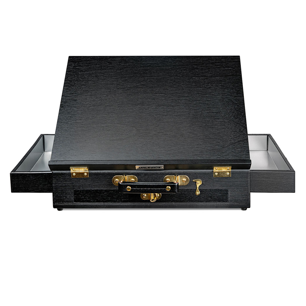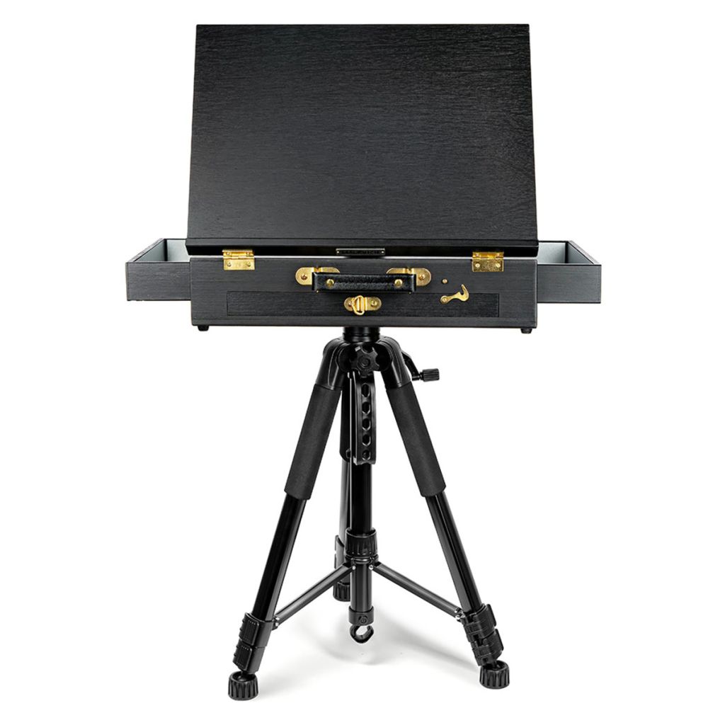 Этюдный ящик на алюминиевой треноге компактен и лёгок в сборке. Тренога складная и к ней прилагается чехол. Этюдник имеет два выдвижных ящика с внутренней отделкой металлом, а также видвижная подставка под палитру спереди. Планшет позволяет закрепить бумагу и рисовать акварелью, гуашью или пастелью. Наклон планшета можно регулировать. Характеристики: Высота 164 см. Размер планшета 42х32 см. Размер этюдника в сложенном виде 42х32х11 см. Вес 3 кг. Вес треноги 1 кг.
