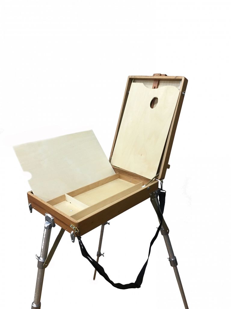 О этюднике: этюдник совмещает в себе свойства мольберта и ящика для красок. На крышке этюдника можно удобно расположить планшет или холст, а в ящике разместить все необходимое для работы: краски, кисти и другие инструменты. В сложенном виде этюдник занимает мало места и удобен в транспортировке. Характеристика: этюдник изготовлен из износостойкой промасленной древесины. Он оснащён выдвижными телескопическими ножками, при помощи которых можно регулировать высоту и положение этюдного ящика. Положение ножек фиксируется завинчиванием болта типа «барашек». Ящик этюдника разделён перегородками на ячейки, в которых удобно хранить художественные принадлежности. В комплектацию входит прямоугольная палитра из фанеры и фанерный планшет, на котором можно закрепить бумагу для работы. Длина 40 см., ширина 28 см. Вес 3,46 кг. Использование: предназначен для использования на выездных работах на природе (на пленэрах), но также может быть использован в мастерской или дома. Этюдник совмещает в себе свойства мольберта и ящика для красок. Производство: производится Подольским-АРТ Центром, который является правопреемником Подольского Производственного Комбината Художественного Фонда СССР, образованного в 1958 году. За время работы продукция «Подольской фабрики» приобрела известность не только на территории России, но и за рубежом.