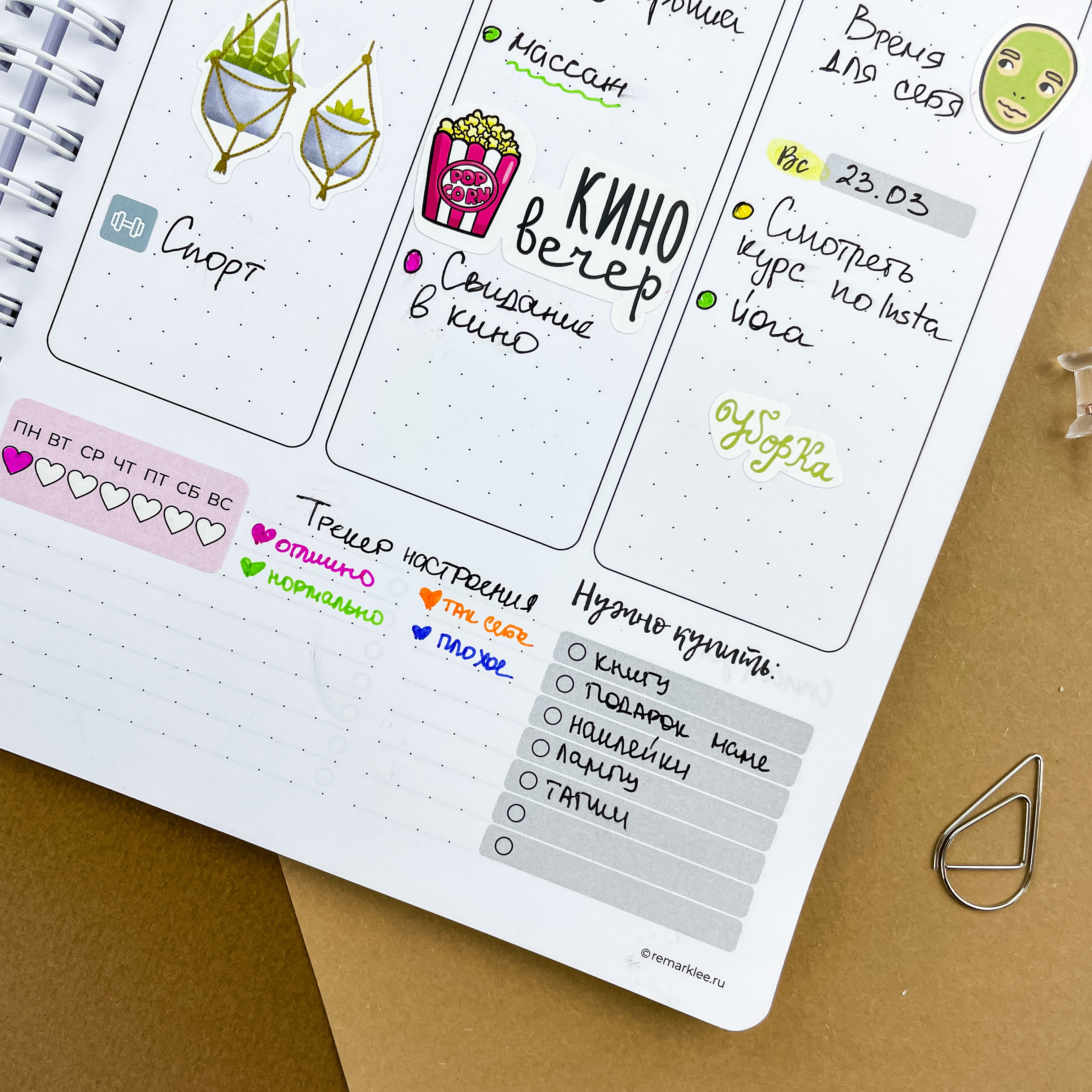 С планером на неделю ваша жизнь точно станет проще. Освободите голову от рутинных задач и выделите главное - ваши мечты и желания. Вместе с еженедельником вы сможете улучшить качество жизни, привить полезные привычки и, конечно же, ничего не забыть ;) Особенности: - Надежный пружинный переплет формата А5; - Обложка из плотного пластика, которая не рвется и не пачкается; - 166 страниц плотной и тактильно приятной бумаги на целый год продуктивного планирования Последовательность страниц: — картинки-антистресс - 1 стр; — список желаний - 2 стр; — картинки-антистресс - 1 стр; — письмо в будущее - 1 стр; — колесо баланса - 2 стр; — полезная полка - 2 стр; — что посмотреть - 3 стр; — 12 разворотов на месяц - 24 стр; — трекер привычек - 6 стр (по 2 на 1 странице) — 53 разворота на неделю - 106 стр; — страницы в точку - 18 стр.