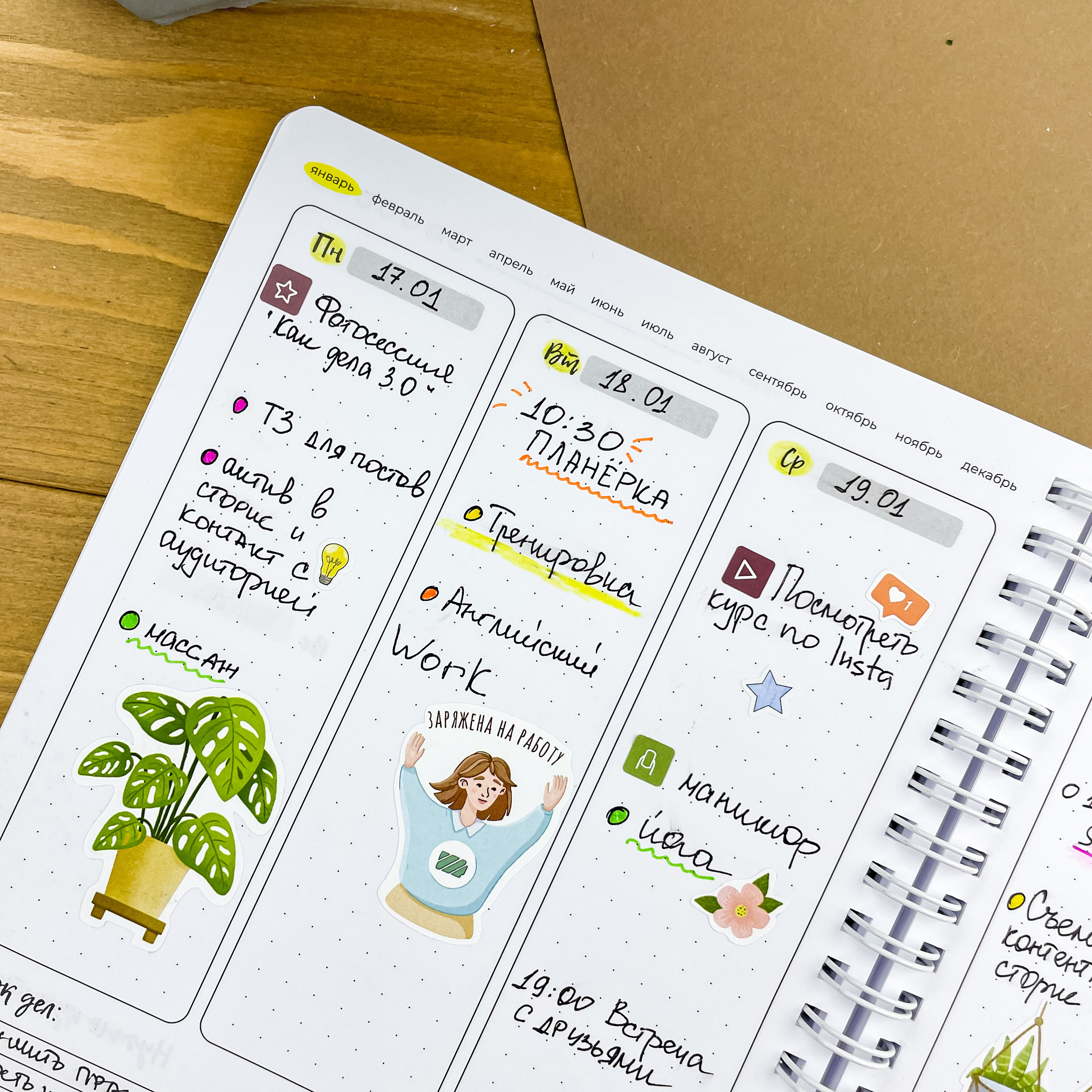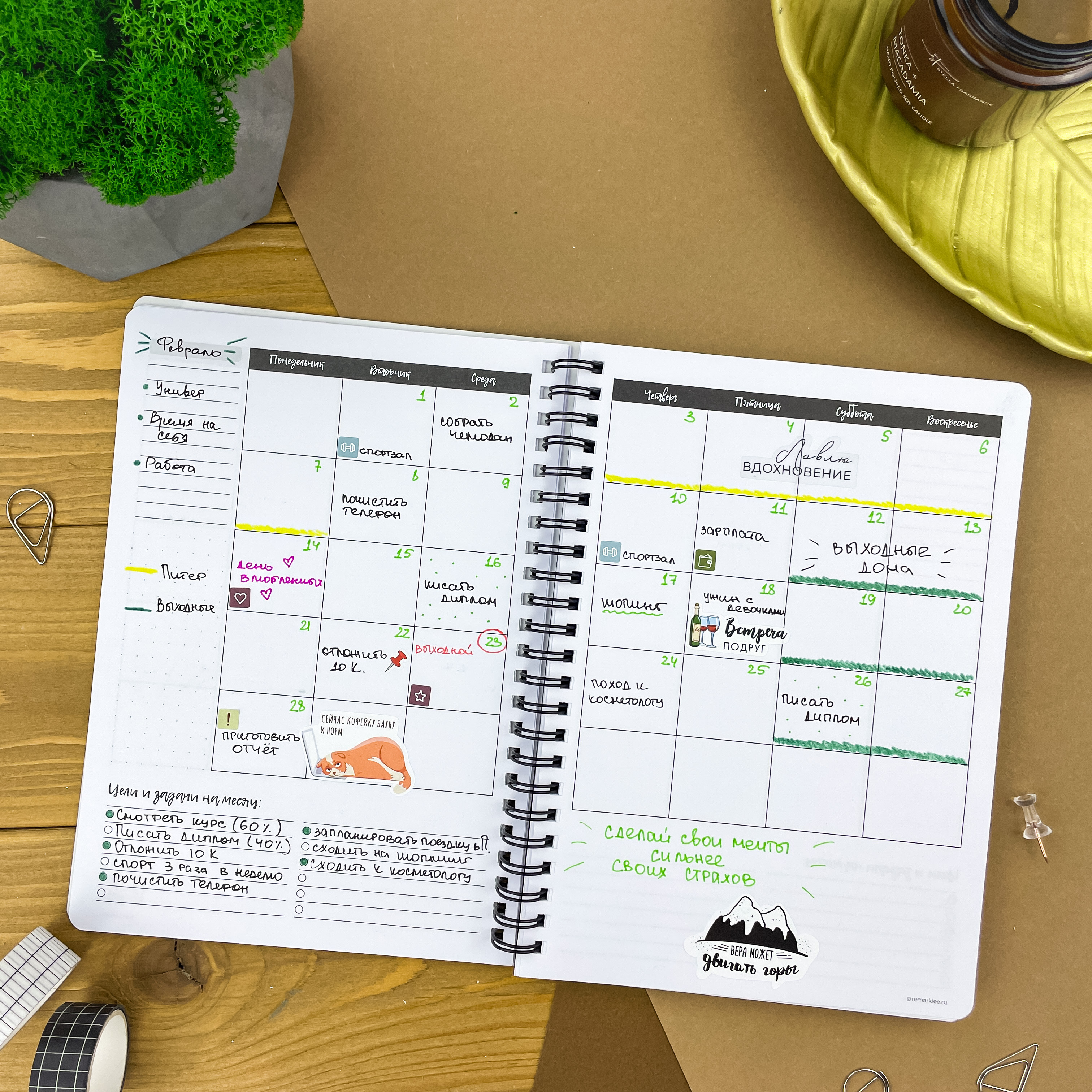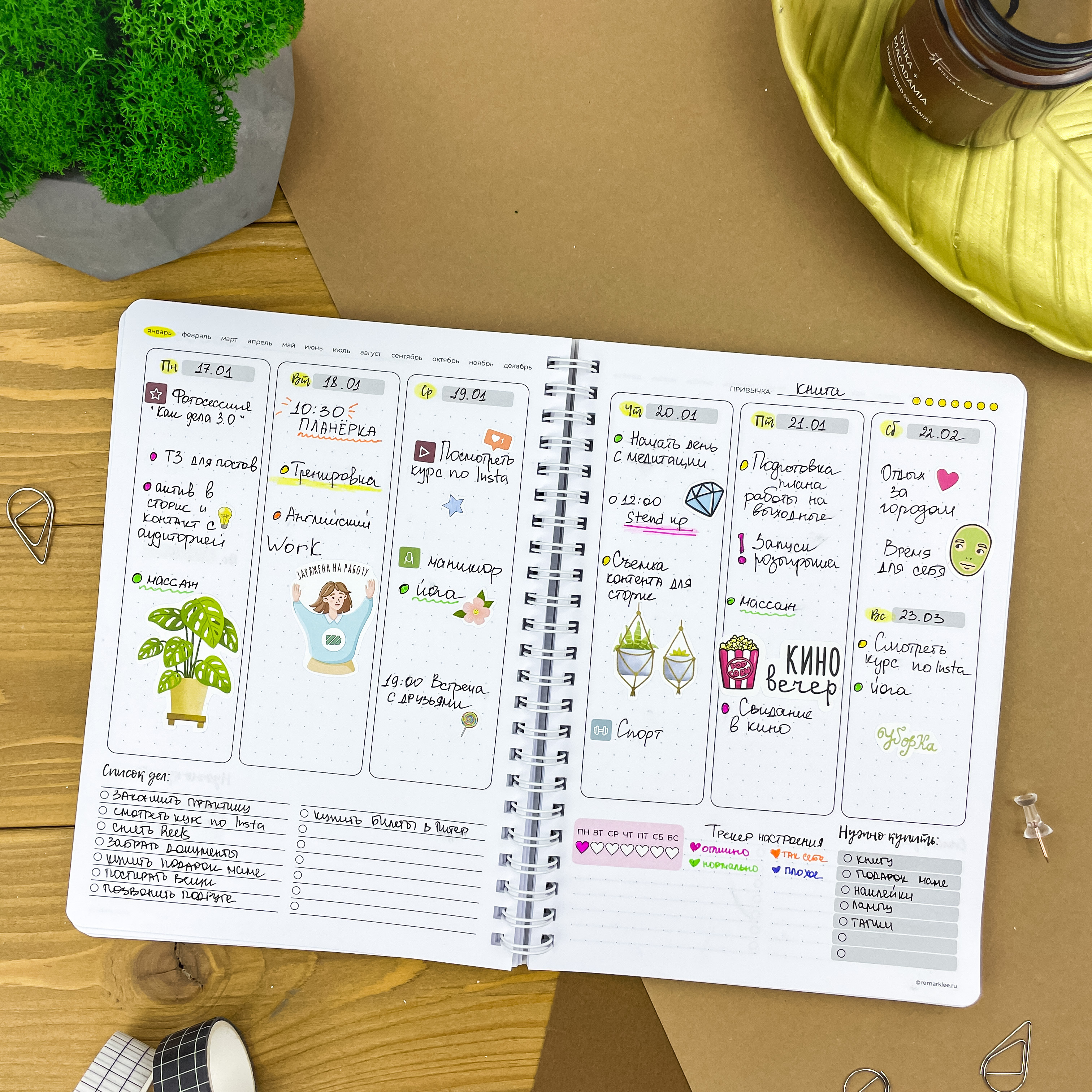 С планером на неделю ваша жизнь точно станет проще. Освободите голову от рутинных задач и выделите главное — ваши мечты и желания. Вместе с еженедельником вы сможете улучшить качество жизни, привить полезные привычки и, конечно же, ничего не забыть ;) Особенности: - Надежный пружинный переплет формата А5; - Обложка из плотного пластика, которая не рвется и не пачкается; - 166 страниц плотной и тактильно приятной бумаги на целый год продуктивного планирования Последовательность страниц: — картинки-антистресс - 1 стр; — список желаний - 2 стр; — картинки-антистресс - 1 стр; — письмо в будущее - 1 стр; — колесо баланса - 2 стр; — полезная полка - 2 стр; — что посмотреть - 3 стр; — 12 разворотов на месяц - 24 стр; — трекер привычек - 6 стр (по 2 на 1 странице) — 53 разворота на неделю - 106 стр; — страницы в точку - 18 стр.
