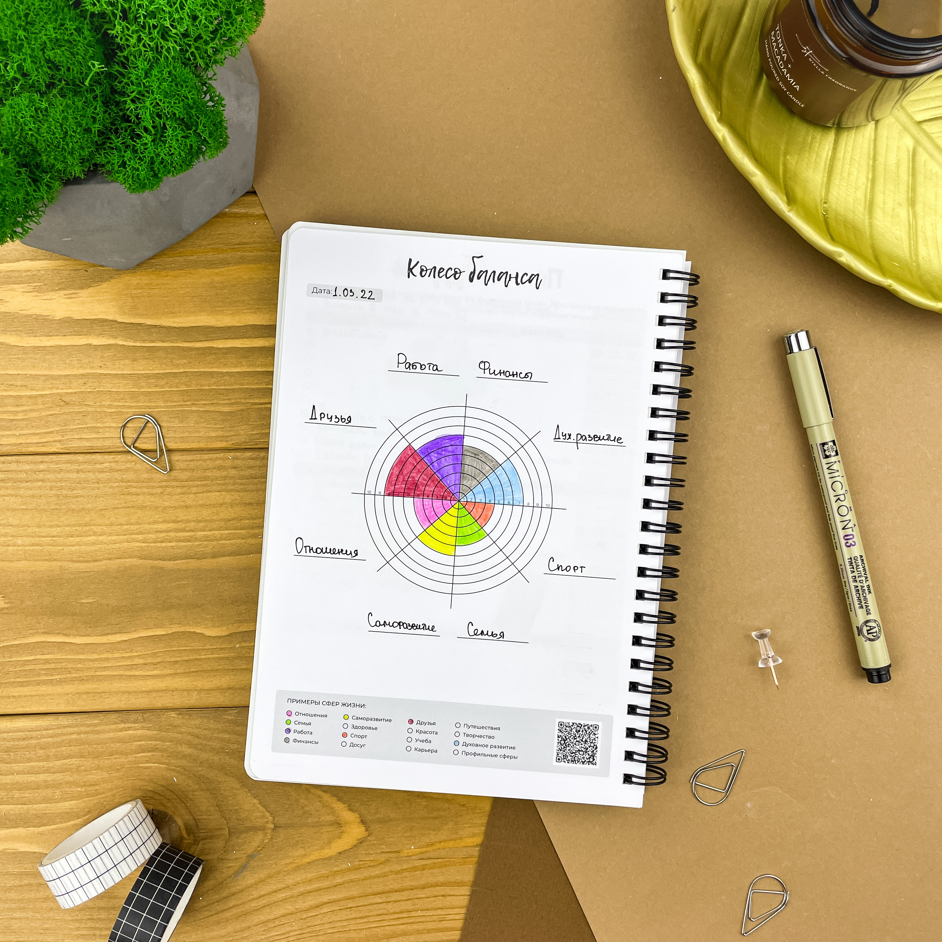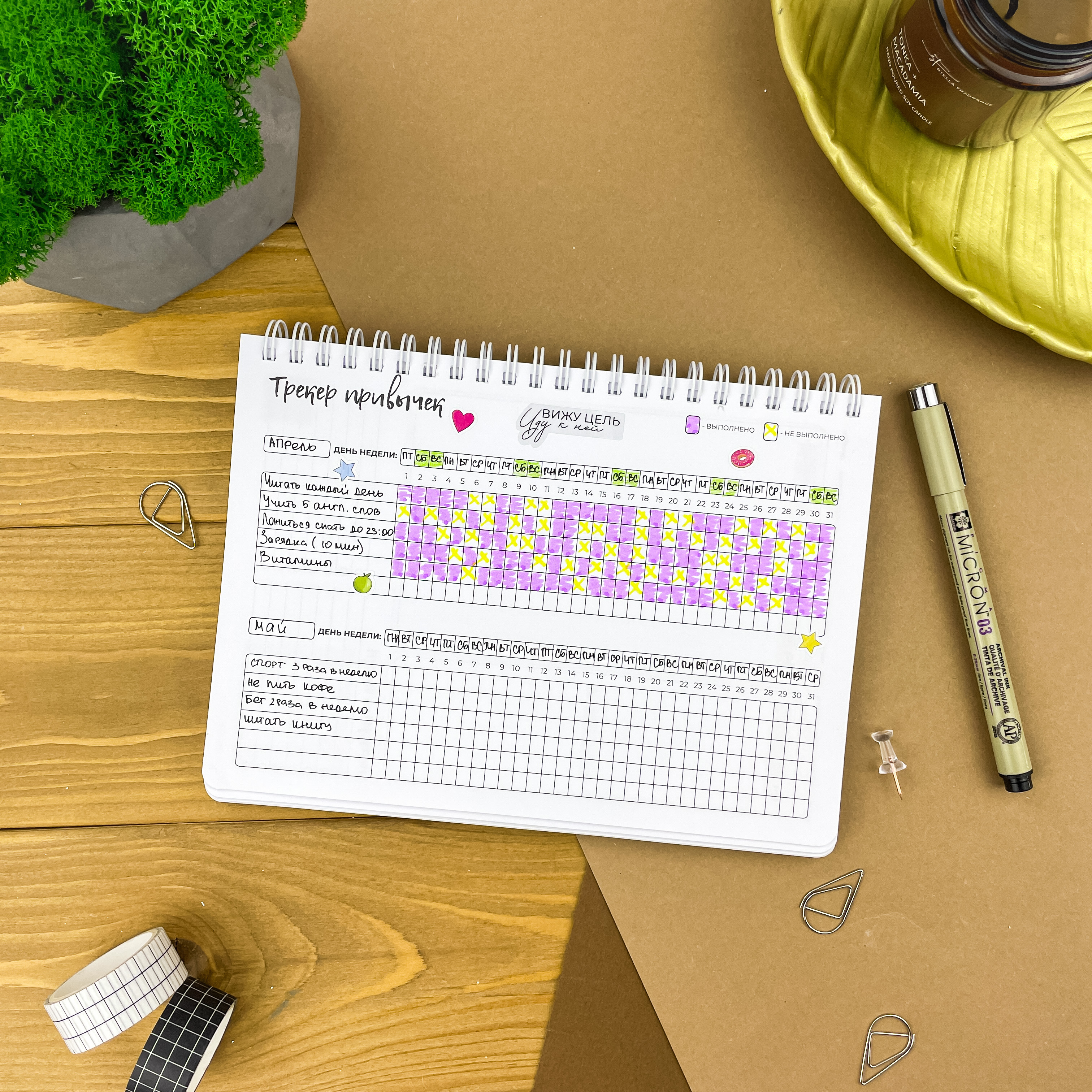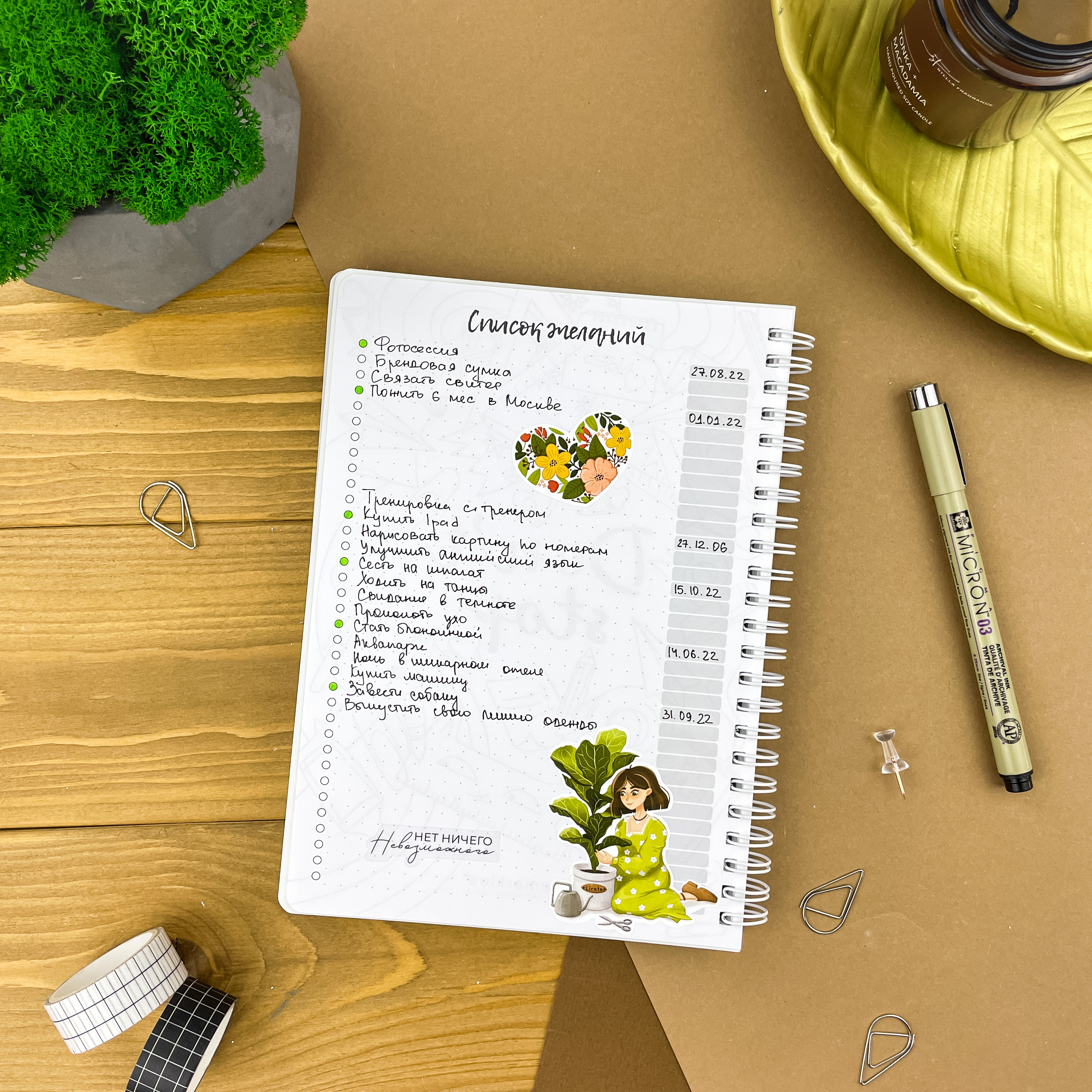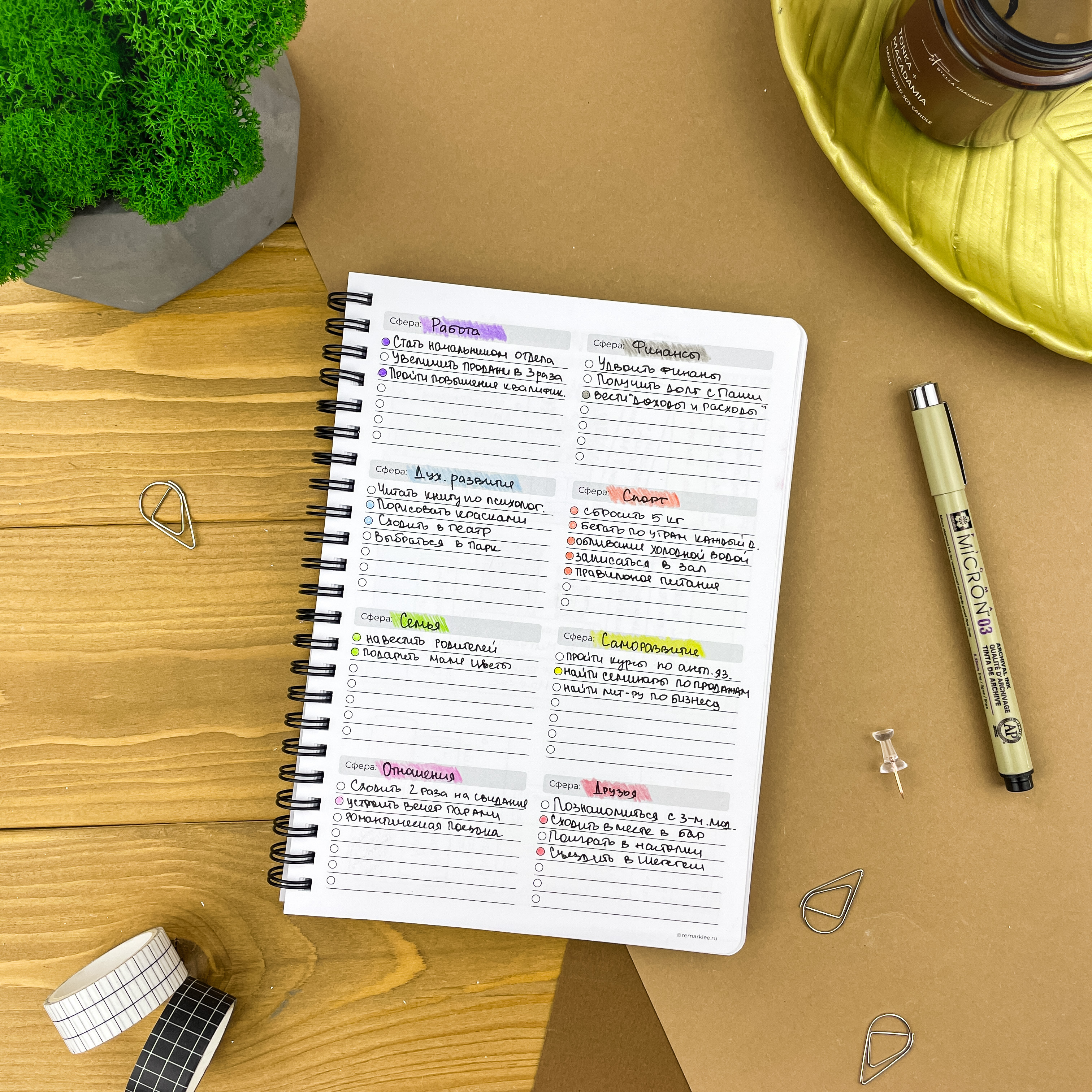 С планером на неделю ваша жизнь точно станет проще. Освободите голову от рутинных задач и выделите главное — ваши мечты и желания. Вместе с еженедельником вы сможете улучшить качество жизни, привить полезные привычки и, конечно же, ничего не забыть ;) Особенности: - Надежный пружинный переплет формата А5; - Обложка из плотного пластика, которая не рвется и не пачкается; - 166 страниц плотной и тактильно приятной бумаги на целый год продуктивного планирования Последовательность страниц: — картинки-антистресс - 1 стр; — список желаний - 2 стр; — картинки-антистресс - 1 стр; — письмо в будущее - 1 стр; — колесо баланса - 2 стр; — полезная полка - 2 стр; — что посмотреть - 3 стр; — 12 разворотов на месяц - 24 стр; — трекер привычек - 6 стр (по 2 на 1 странице) — 53 разворота на неделю - 106 стр; — страницы в точку - 18 стр.