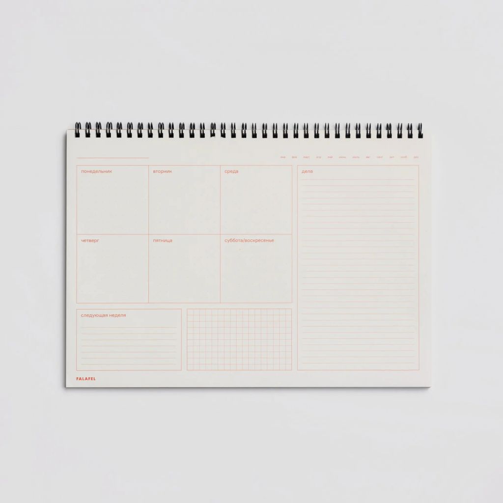 Настольные планировщики от бренда FALAFEL BOOKS формата А4 — это удобный вариант для офиса и дома. Планировщики представляют собой компактные блокноты с различной линовкой, вы можете выбрать наиболее удобный вариант для различных задач — в точку, с линовкой To-do Pad для текущих задач и списков, с линовкой по дням недели или по часам. Листы планировщика легко и аккуратно удаляются благодаря креплению на пружине.