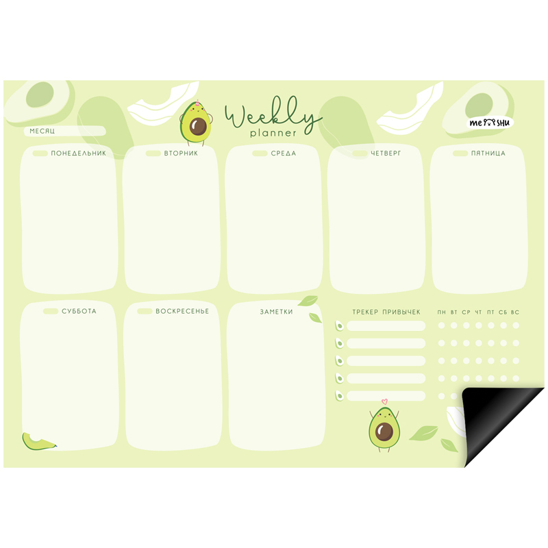 Магнитный планер на неделю MESHU Avocado – отличный помощник в планировании времени. Планер формата А4 выполнен из картона плотностью 200 г/м2, покрытого магнитным винилом. Ламинация позволяет многократно писать и стирать надписи. Размер магнитного расписания – 210*297 мм. В комплекте прилагается маркер на магните со стирателем, которым очень удобно корректировать записи и крепить его к любой металлической поверхности (например, к холодильнику). Внимание! Используйте только маркер на водной основе. Для очистки поверхности используйте влажную салфетку. Планер выполнен в универсальном оригинальном дизайне. Он поможет запомнить задачи, спланировать расписание и встречи с коллегами, друзьями или семьёй. Трекер привычек позволит вам добиться успехов в любых начинаниях: бегать по утрам, раньше вставать или ложиться спать и правильно питаться.