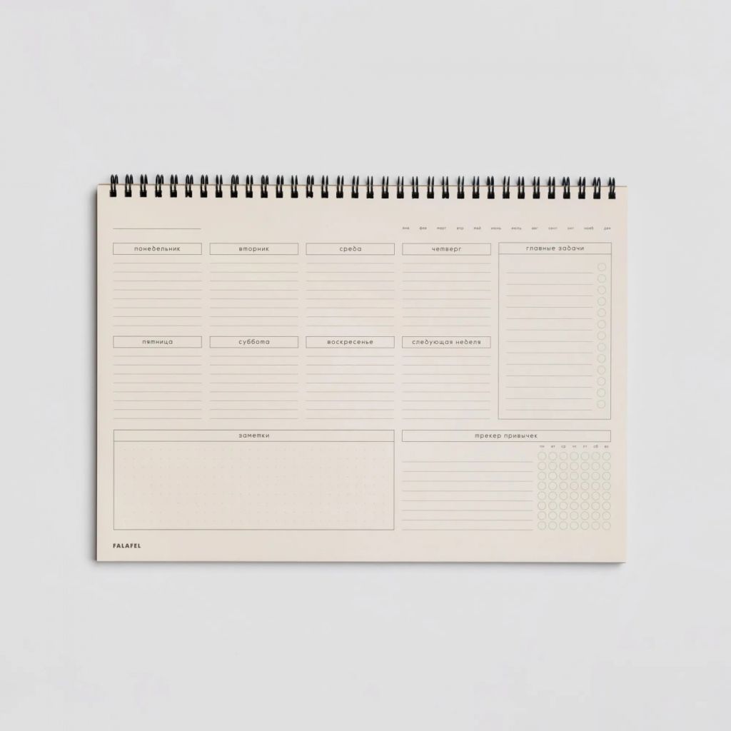 Настольные планировщики от бренда FALAFEL BOOKS формата А4 — это удобный вариант для офиса и дома. Планировщики представляют собой компактные блокноты с различной линовкой, вы можете выбрать наиболее удобный вариант для различных задач — в точку, с линовкой To-do Pad для текущих задач и списков, с линовкой по дням недели или по часам. Листы планировщика легко и аккуратно удаляются благодаря креплению на пружине.