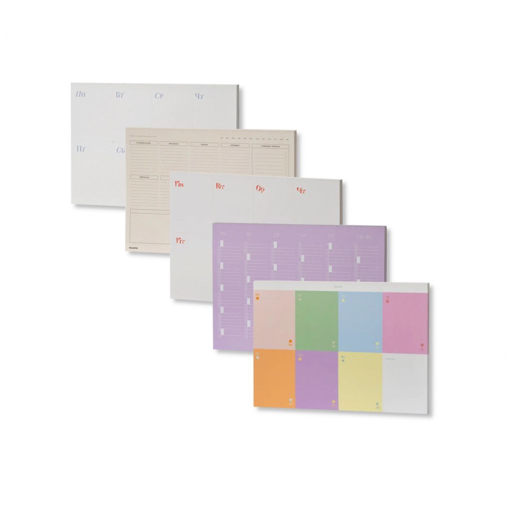 Настольные планировщики от бренда FALAFEL BOOKS формата А4 — это удобный вариант для офиса и дома. Планировщики представляют собой компактные блокноты с различной линовкой, вы можете выбрать наиболее удобный вариант для различных задач — в точку, с линовкой To-do Pad для текущих задач и списков, с линовкой по дням недели или по часам. Листы планировщика легко и аккуратно удаляются благодаря специальному клеевому креплению на корешке.