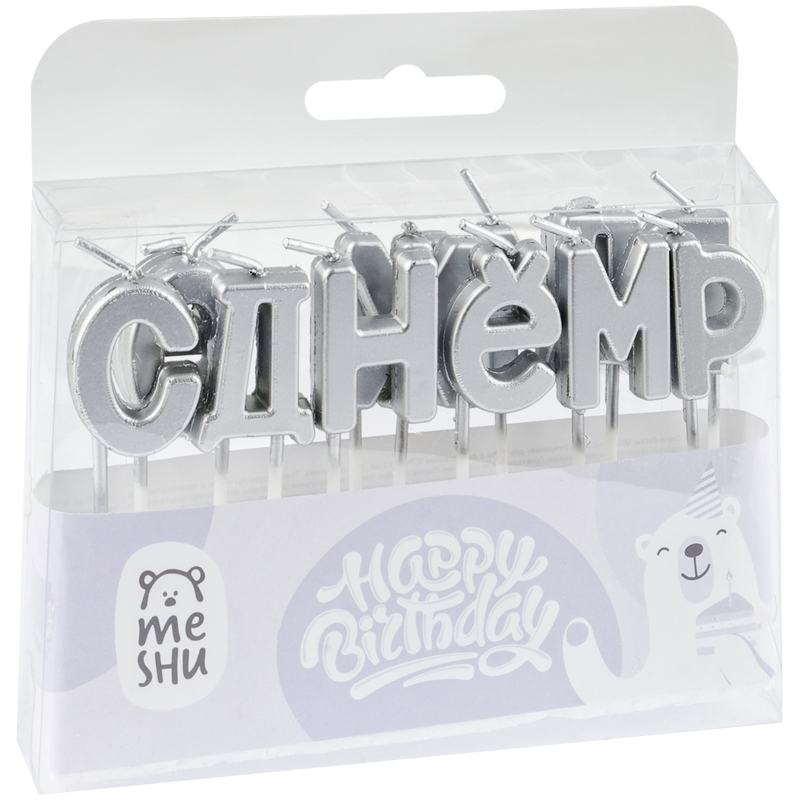 Свечи для торта с держателями MESHU "Буквы. С Днем Рождения", 2,7 см, серебряные
