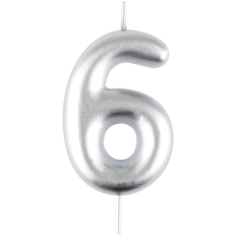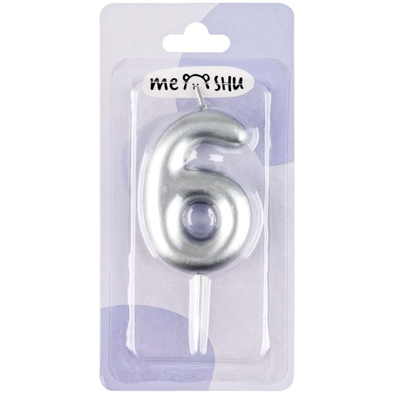 Свеча для торта с держателем MESHU "Цифра 6", 6 см, серебряная, блистер