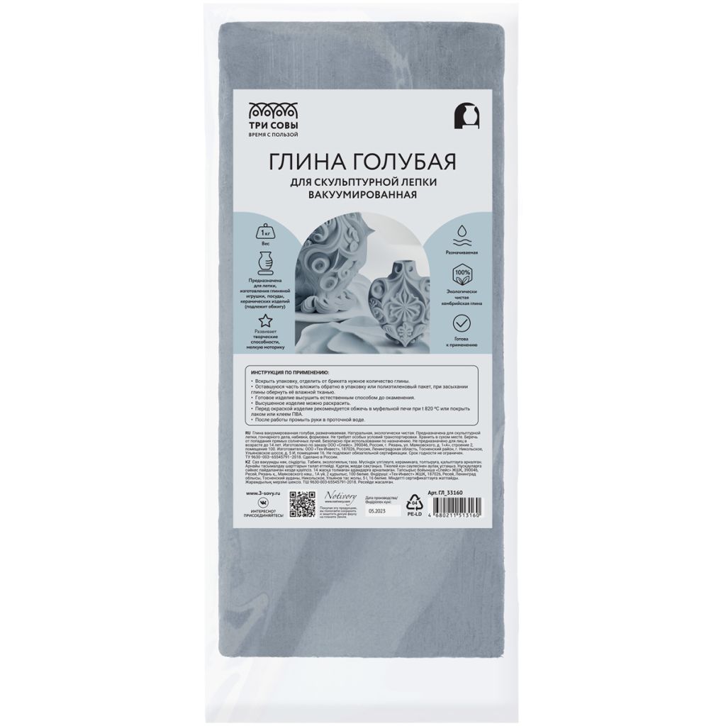 Самозатвердевающая глина «ТРИ СОВЫ» – это идеальное решение для занятий лепкой дома и в студиях, работы на гончарном круге, изготовления глиняной игрушки, изделий художественного промысла, изготовления посуды и других керамических изделий. Брусок весом 1000 граммов упакован в вакуумный пакет. Экологически чистая кембрийская глина Чкаловского месторождения Ленинградской области при смешивании с водой образует пластичную массу, что позволяет использовать её для скульптурной и художественной лепки. Не содержит химических добавок, не вызывает аллергической реакции. Глина затвердевает на воздухе, но готовое изделие рекомендуется обжечь в муфельной печи для придания большей прочности. Готовый элемент можно раскрасить. Занятия лепкой – популярный и любимый многими вид творчества, благотворно влияющий на эмоциональное состояние как взрослого, так и ребёнка. Тренирует усидчивость, прививает умение концентрировать внимание. Также способствует развитию мелкой моторики, стимулирует воображение, образное мышление и творческие способности.