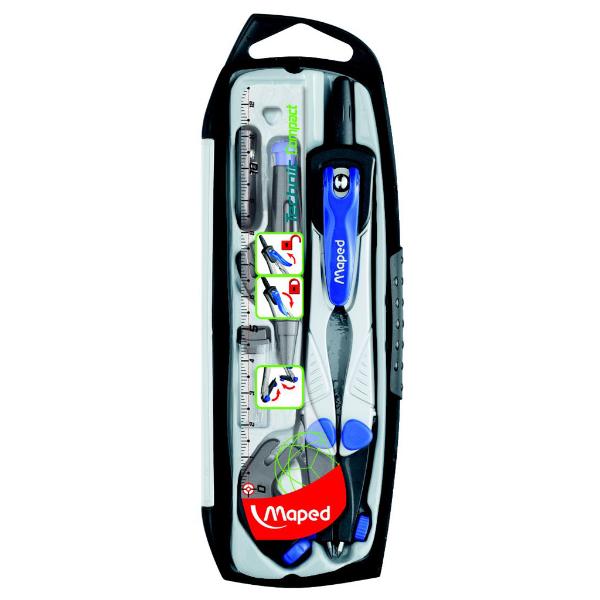Складываемые штанги: безопасное и компактное хранение. Максимальный диаметр 360 мм, 500 мм с удлинителем. В наборе 5 предметов в ударопрочном футляре: Technic Compact циркуль с грифелем; насадка с универсальным держателем; насадка с автоматическим карандашом 0,5 мм; точилка для грифелей; упаковка грифелей.