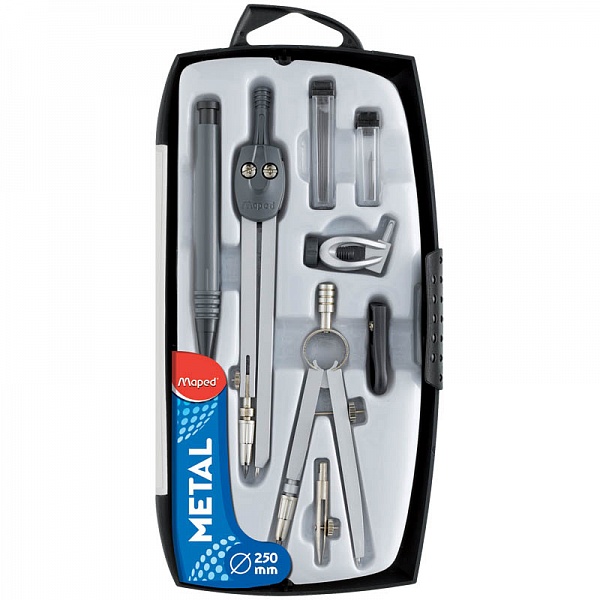 Готовальня с металлическим циркулем в ударопрочном футляре. Штанги повышенной жесткости. Длина циркуля 13 см. В комплекте: мини крон-циркуль, насадки с мех. карандашом, универсальным держателем и рейсфедером, точилка, ластик и упаковка грифелей. Максимальный диаметр окружности 250 мм.