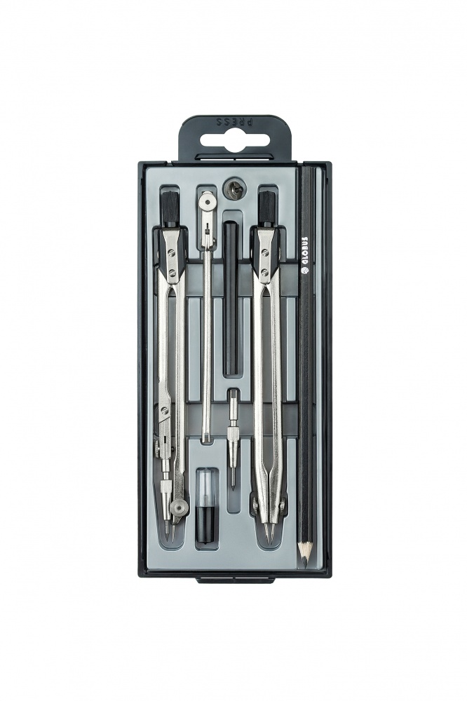 Набор чертежный, серия Technica. В наборе 8 предметов: циркуль чертежный, длина 125 мм, нержавеющий металл; циркуль разметочный, пенал с запасным грифелем, рейсфедерная вставка, ручка, удлинитель, запасной винт, карандаш черно-графитный. Максимальный диаметр окружности 300 мм.