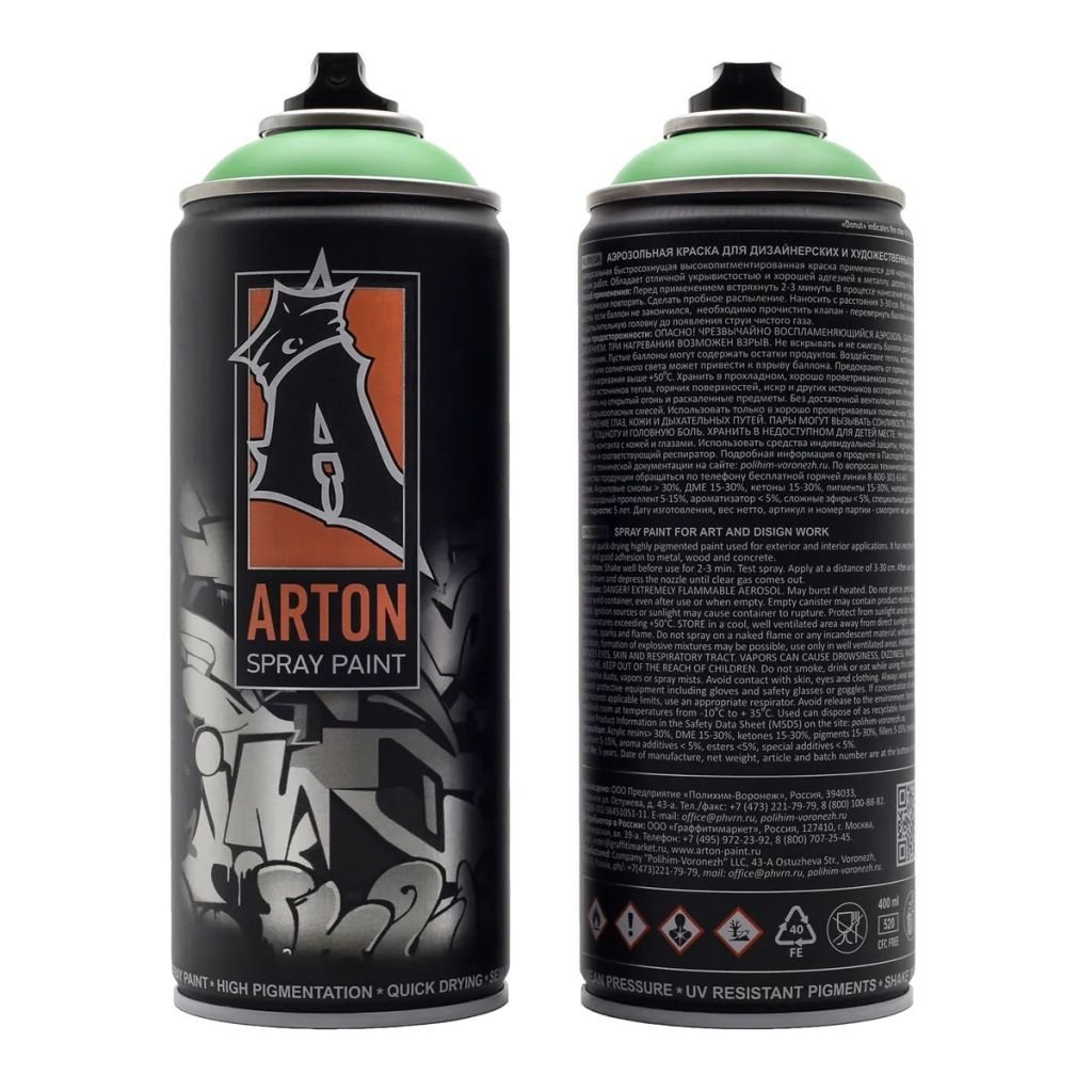 Аэрозольная краска Arton на сегодняшний день является самой одной из самых популярных красок в России как среди начинающих художников, так и среди профессионалов. Выпускается с оптимальным давлением, которое позволит Вам равномерно и плотно покрывать любые поверхности. В основе краски Arton – качественный пигмент, который хорошо ложится, не растекается и мало подвержен выгоранию. Arton несколько лет является главным выбором у организаторов фестивалей и конкурсов при выборе аэрозольной краски. С 2009 года краска входит в ар ичной продукции конкурентов) - Абсолютно матовая - Высокая кроющая способность ,перекрывает хром с первого раза - Краска не растрескивается - Высокая пигментация - Быстрое время высыхания - Бесперебойная работа - Высокая скорость нанесения - Специальный состав краски исключающий подтеки - Нанесение на все виды поверхностей - Низкое, среднее давление в зависимости от кэпов - Толщина линии зависит от силы нажатия кэпа - Мягкая пружина клапана.