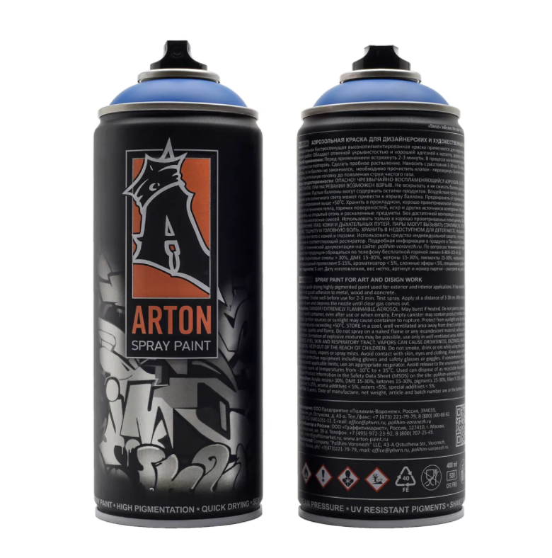 Аэрозольная краска Arton на сегодняшний день является самой одной из самых популярных красок в России как среди начинающих художников, так и среди профессионалов. Выпускается с оптимальным давлением, которое позволит Вам равномерно и плотно покрывать любые поверхности. В основе краски Arton – качественный пигмент, который хорошо ложится, не растекается и мало подвержен выгоранию. Arton несколько лет является главным выбором у организаторов фестивалей и конкурсов при выборе аэрозольной краски. С 2009 года краска входит в ар ичной продукции конкурентов) - Абсолютно матовая - Высокая кроющая способность ,перекрывает хром с первого раза - Краска не растрескивается - Высокая пигментация - Быстрое время высыхания - Бесперебойная работа - Высокая скорость нанесения - Специальный состав краски исключающий подтеки - Нанесение на все виды поверхностей - Низкое, среднее давление в зависимости от кэпов - Толщина линии зависит от силы нажатия кэпа - Мягкая пружина клапана.
