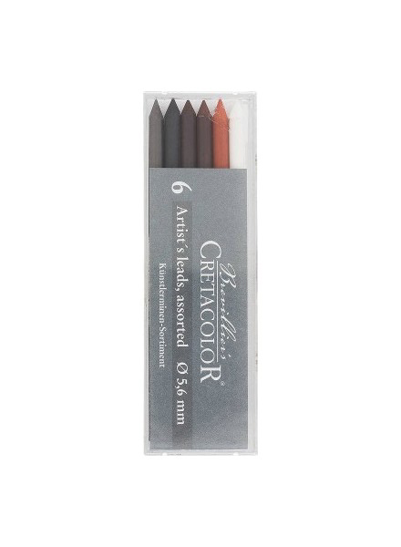 Наборы содержат по 6 грифелей для цангового карандаша. Грифели выполнены из графита, угля или сангины, обладают разными цветами и степенью твердости. Подходят для цанговых карандашей любого бренда совместимых с грифелями толщиной 5,6 мм.