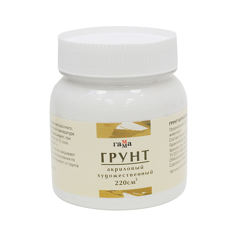 О товаре: грунт, производства компании «Гамма», изготовлен на основе дисперсии акриловой смолы. Грунт практичен и удобен в применении. Образует плотную матовую пленку. Выпускается в пластиковых банках по 220 миллилитров. Применение: используется для подготовки поверхности перед нанесением масла, акрила, темперы или гуаши. Увеличивает адгезию красок. Производство: выпускается российской компанией «Гамма», которая уже более 100 лет экспериментирует с пигментами, производит художественные краски и другие товары для творчества.