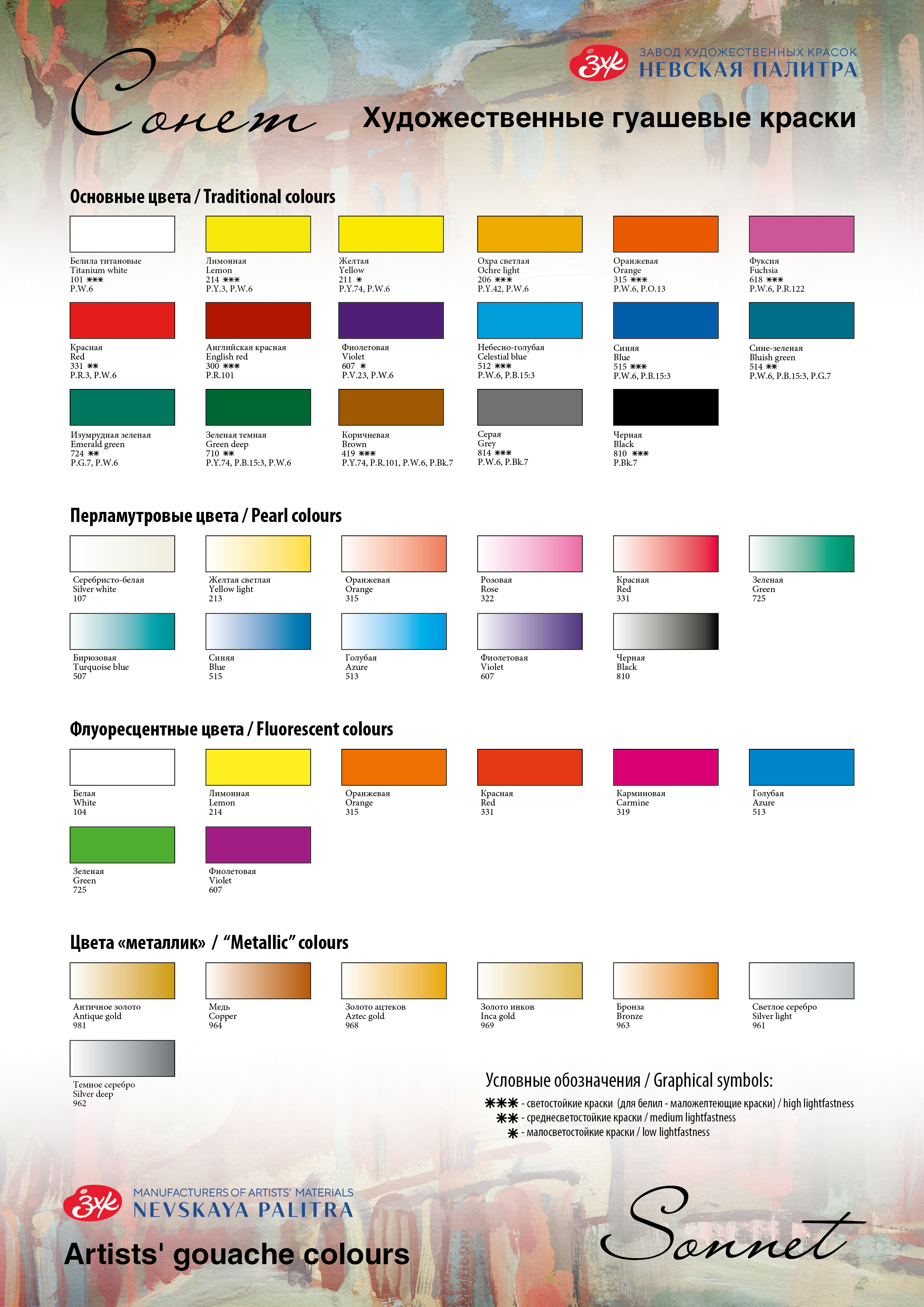 О серии: гуашь «Сонет» широко используется для художественных и дизайнерских работ. Отлично подходит для детского творчества. В отличие от используемых при изготовлении профессиональной гуаши пигментов и гуммиарабика как связующего, в рецептуре гуаши «Сонет» использованы пигментные пасты и синтетическое связующее. Гуашь «Сонет» хорошо ложится на бумагу и картон. При необходимости разбавляется водой и легко размывается. После высыхания приобретает бархатистый матовый оттенок. Применение: для художественных и оформительских работ, часто используется для детского творчества. Производство: гуашь «Сонет» производится заводом художественных красок Невская палитра, расположенным в городе Санкт-Петербурге. Завод уже более 80 лет выпускает продукцию для профессиональных художников и любителей творчества.