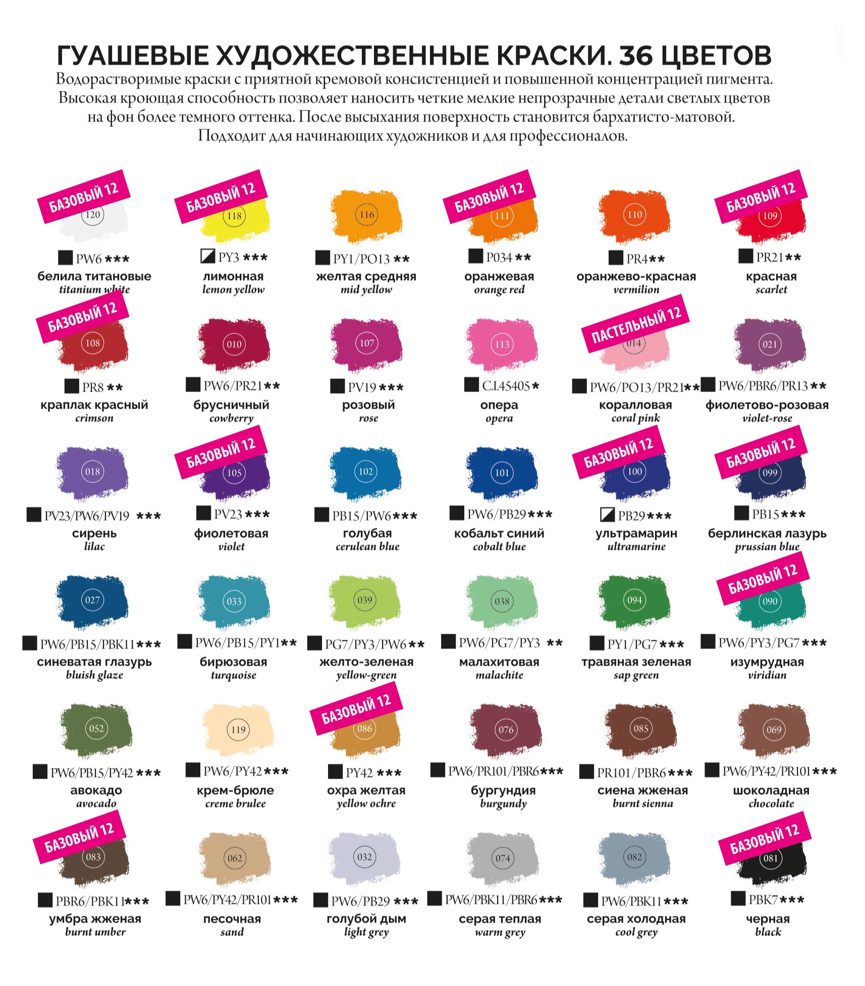 Гуашь «Малевичъ» — это водорастворимая, комфортная для работы краска с приятной кремовой консистенцией и повышенной концентрацией пигмента. Высокая кроющая способность позволяет наносить четкие мелкие непрозрачные детали светлых тонов на фон темного оттенка. Краски отлично ложатся, имеют яркие, насыщенные цвета. Формула со значительным содержанием пигмента обеспечивает простоту в смешивании и создании оттенков. После высыхания поверхность становится бархатисто-матовой. В наборе 36 баночек по 12 мл., состав набора и выкраски вы можете посмотреть на дополнительных фото товара.