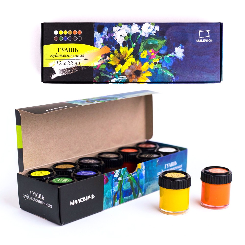 Гуашь «Малевичъ» — это водорастворимая, комфортная для работы краска с приятной кремовой консистенцией и повышенной концентрацией пигмента. Высокая кроющая способность позволяет наносить четкие мелкие непрозрачные детали светлых тонов на фон темного оттенка. Краски отлично ложатся, имеют яркие, насыщенные цвета. Формула со значительным содержанием пигмента обеспечивает простоту в смешивании и создании оттенков. После высыхания поверхность становится бархатисто-матовой. В состав набора входят 12 гуашевых красок в баночках 22мл следующих цветов: 00 Белила титановые, 01 Берлинская лазурь, 02 Желтый светлый, 03 Краплак красный, 04 Красный, 05 Лимонный, 06 Оранжевый, 07 Охра желтая, 08 Травяной зеленый, 09 Ультрамарин, 10 Умбра жженая, 11 Черный.