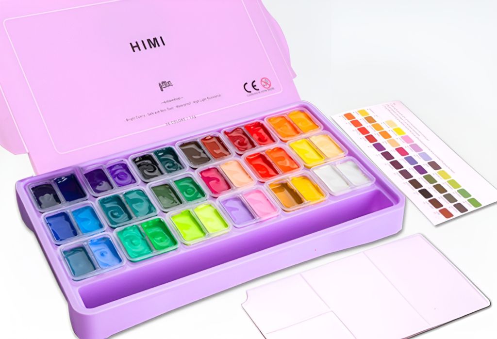 Гуашь HIMI представлена в двойных пластиковых кюветах, объёмом 12 мл. На каждой кювете указан цвет и дата изготовления. Удобный пенал с отдельными ячейками под каждый цвет, есть отсек под кисти, а также в комплекте представлена палитра для смешивания красок. Достаточно снять крышку пенала и все готово к работе. Гуашь предназначена для детского творчества, для выполнения художественных, декоративных и оформительских работ, отлично подойдет для художественных школ, для начинающих и профессиональных художников. Краски не трескаются и не осыпаются при высыхании и подходит для рисования на холсте и бумаге. Набор поставляется без кисти.