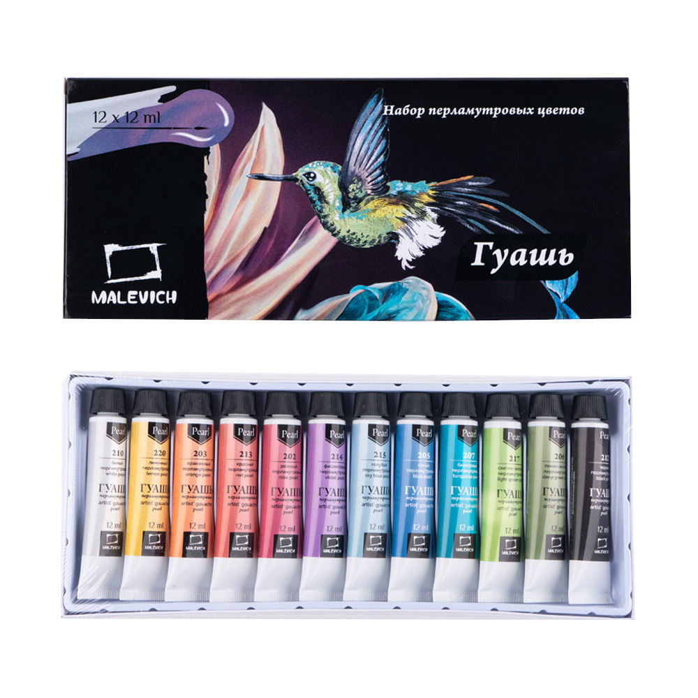 Гуашь Малевич - водорастворимая, комфортная для работы краска с приятной кремовой консистенцией, неизменно с повышенной концентрацией пигмента. Высокая кроющая способность позволяет наносить четкие мелкие непрозрачные детали светлых и темных оттенков с перламутровым блеском. Гуашевые краски быстро сохнут, надолго сохраняют яркий и насыщенный цвет и блеск. Набор из 12 цветов блестящей гуаши подходит как для школьников, учеников художественных школ, начинающих художников, так и для профессиональных иллюстраторов.