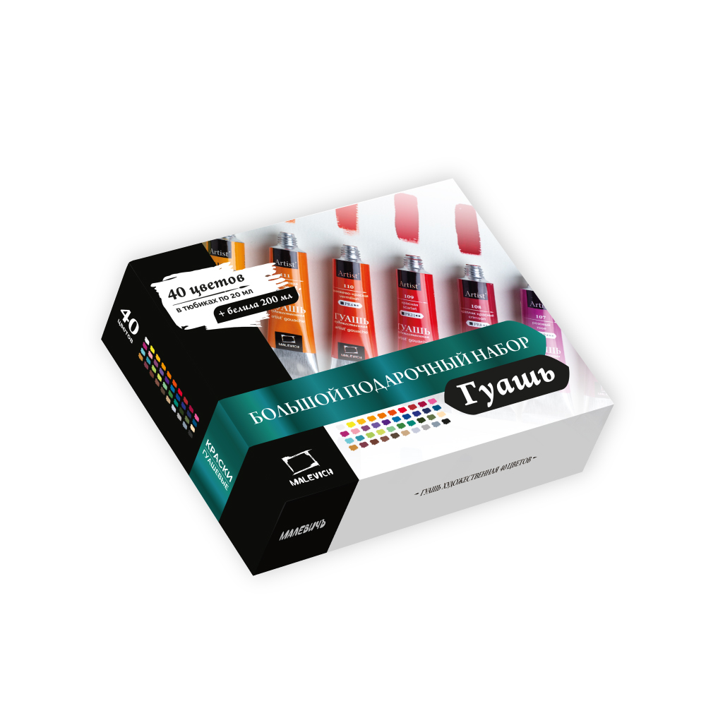 Гуашь «Малевичъ» — это водорастворимая, комфортная для работы краска с приятной кремовой консистенцией и повышенной концентрацией пигмента. Высокая кроющая способность позволяет наносить четкие мелкие непрозрачные детали светлых тонов на фон темного оттенка. Краски отлично ложатся, имеют яркие, насыщенные цвета. После высыхания поверхность становится бархатисто-матовой. Подходит как для начинающих художников, так и для профессионалов. Серия гуаши в тубах представлена поштучно и в наборах различной комплектации. В наборе 40 туб разных цветов по 20 мл и банка белил 200 мл.