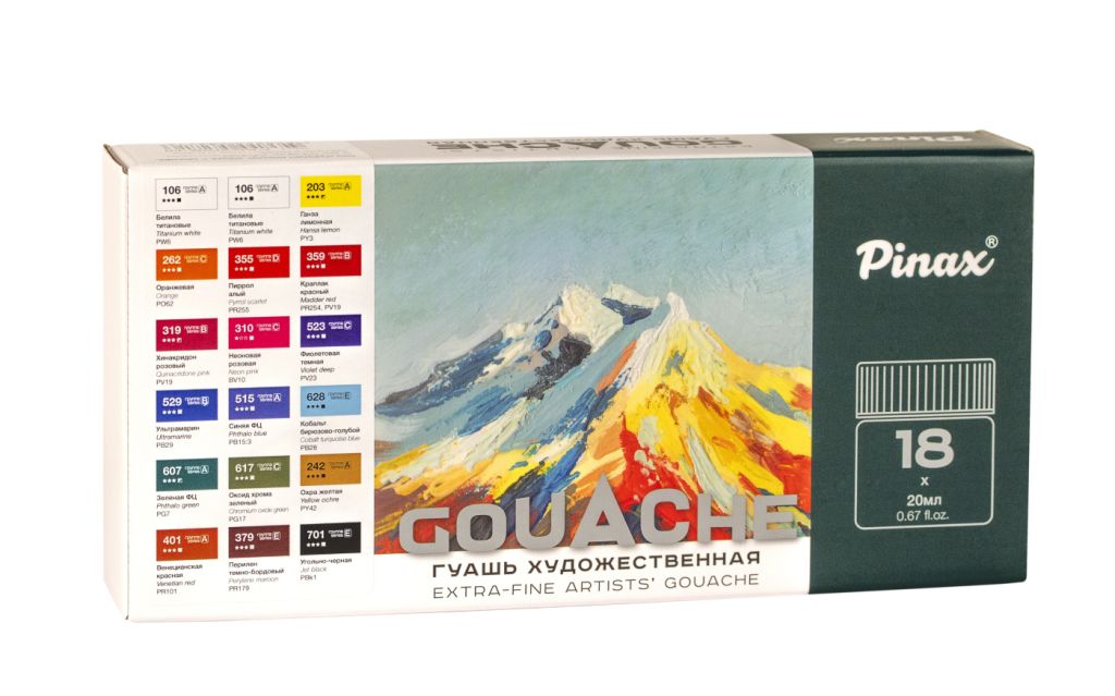 Художественная гуашь Pinax обладает яркостью и высокой пигментацией, что позволяет создавать глубокие и насыщенные оттенки. Благодаря своей кроющей способности эти краски создают новый уровень выразительности, позволяя создавать глубокие и насыщенные оттенки без лишних слоев или многочисленных нанесений, а матовый финиш после высыхания добавит работам глубину и особую эстетику. Для изготовления художественной гуаши используются высококачественные европейские пигменты с максимальной светостойкостью, многие уже знакомы с ними по серии акварельных красок Extra.
