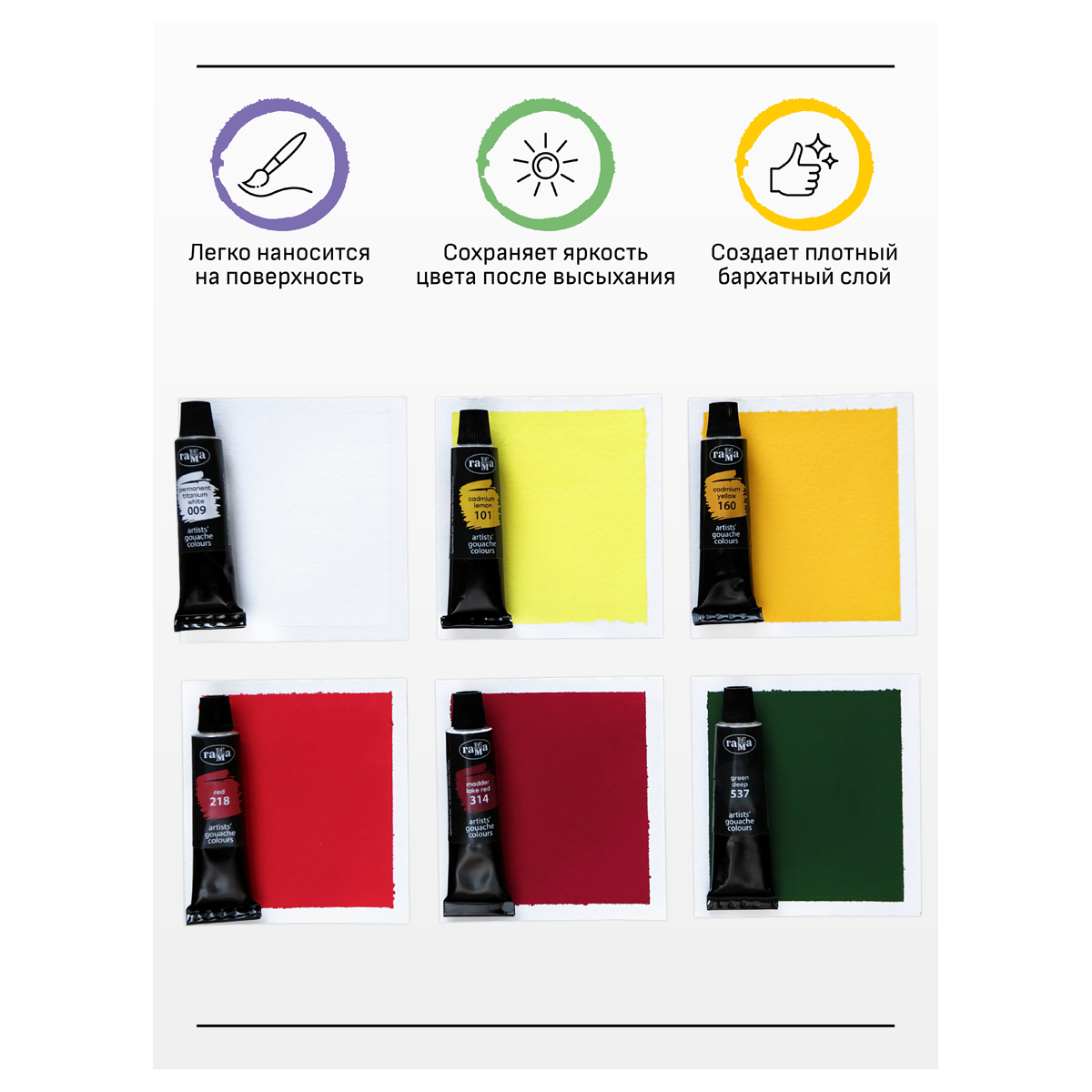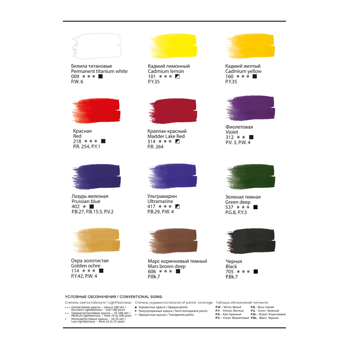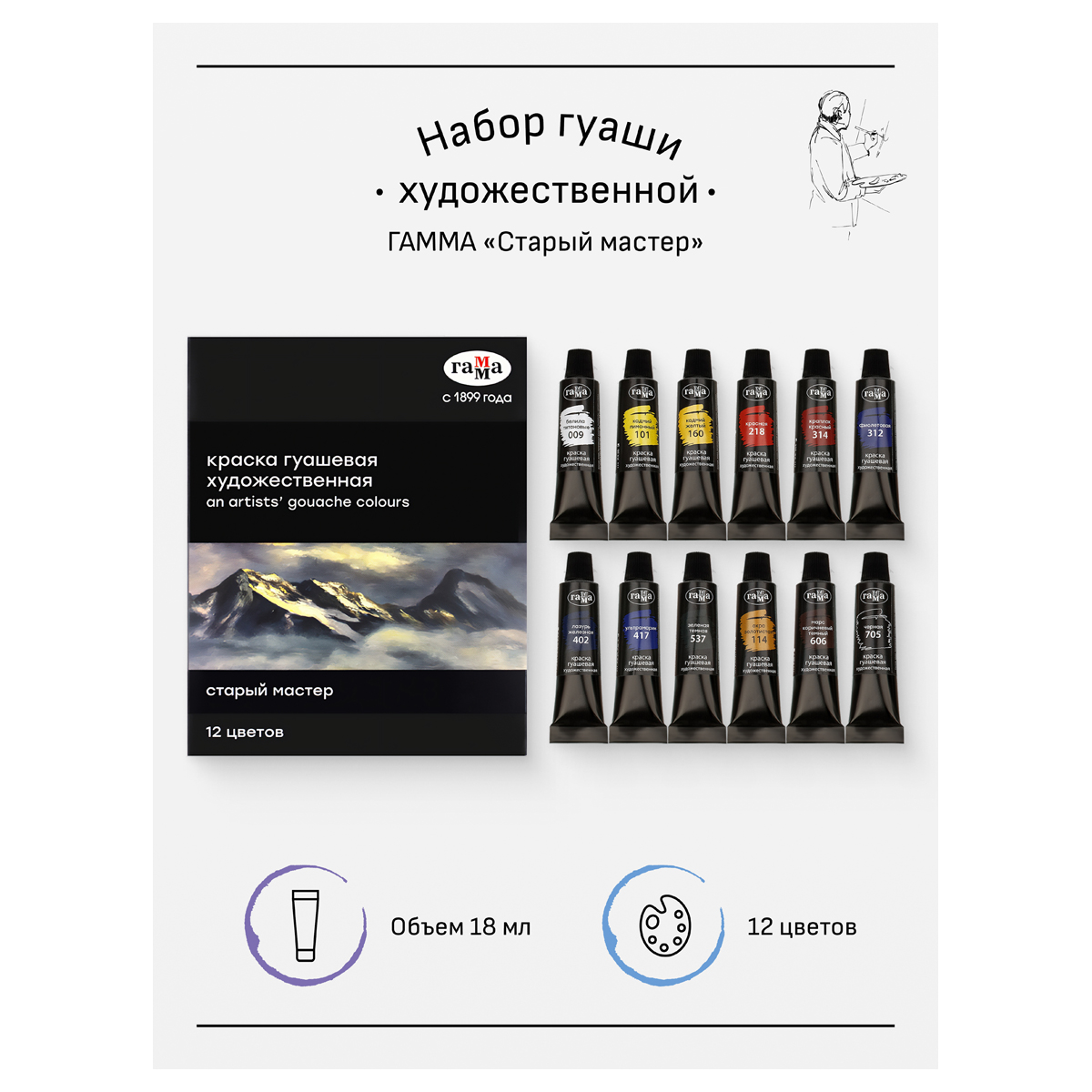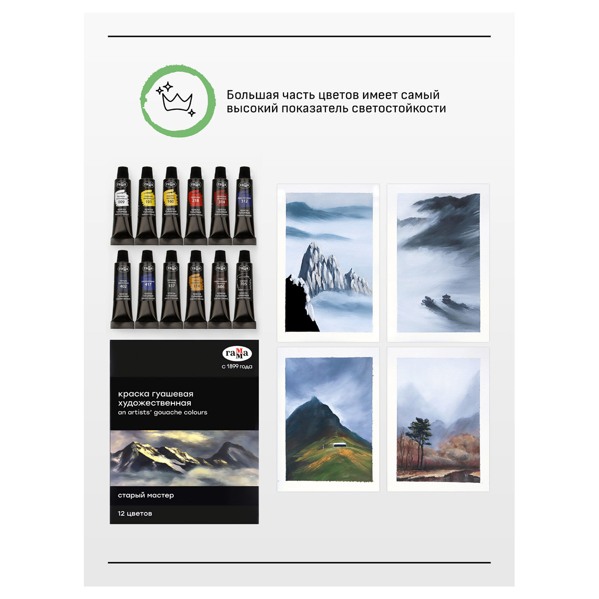 Гуашь художественная «Старый Мастер» — это профессиональные тонкотертые водорастворимые краски. Гуашь имеет уникальную рецептуру, разработанную в собственной исследовательской лаборатории завода совместно с художниками. Краска легко наносится на поверхность, благодаря специальным добавкам сохраняет яркость цвета после высыхания, создает плотный бархатный слой. Краска изготовлена из традиционных художественных пигментов, в том числе пигментов кадмиево-кобальтовой группы. В наборе оптимальная палитра цветов, подобранных профессиональными художниками.