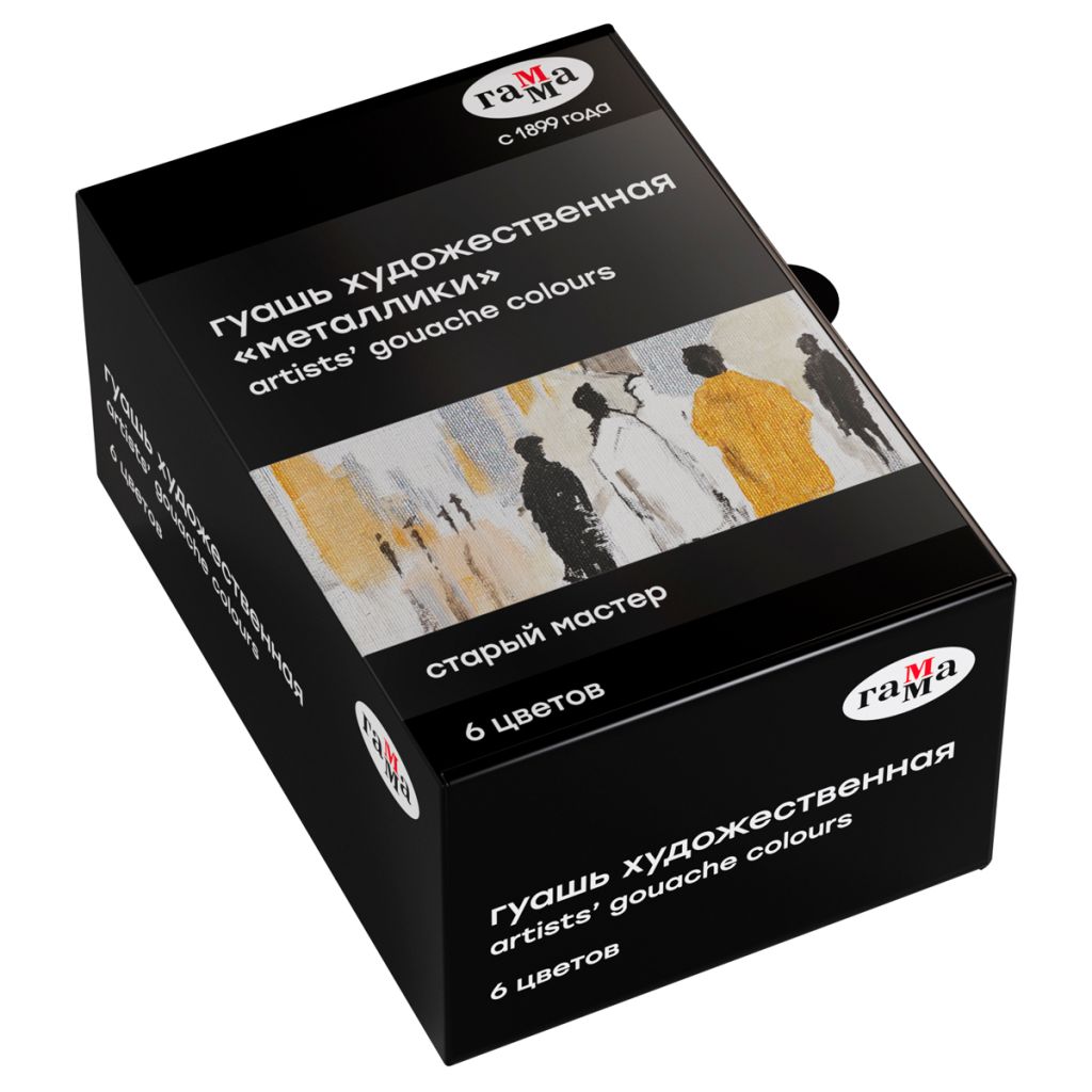 Гуашь художественная "Гамма" серии "Старый мастер" имеет уникальную рецептуру, разработанную в собственной исследовательской лаборатории завода совместно с художниками. Краски изготавливается из тонкодиспесных пигментов, связующего, в состав которого входит раствор растительного клея — гуммиарабика высшей степени очистки. Краска легко наносится на поверхность, благодаря специальным добавкам сохраняет яркость цвета после высыхания, создавая плотный бархатистый слой. Гуашь обладает высокой укрывистостью, отличной разносимостью, а также хорошо смешивается между собой. Большая часть цветов имеет самый высокий показатель светостойкости. Цвета в наборе: золото, серебро, жемчужный, медь, зеленое золото, бронза.