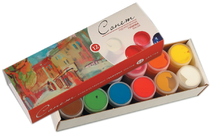 Гуашь «Сонет» широко используется для художественных и дизайнерских работ. Отлично подходит для детского творчества. В отличие от используемых при изготовлении профессиональной гуаши пигментов и гуммиарабика как связующего, в рецептуре гуаши «Сонет» использованы пигментные пасты и синтетическое связующее. Гуашь «Сонет» хорошо ложится на бумагу и картон. При необходимости разбавляется водой и легко размывается. После высыхания приобретает бархатистый матовый оттенок. Преимуществом данной серии является наличие дополнительных цветов: перламутровых, флуоресцентных и «металлик». В палитре представлено 12 основных цветов, которые выпускаются набором (12 цветов по 40 миллилитров) и поштучно в баночках по 100 миллилитров. Гуашь «Сонет» производится заводом художественных красок Невская палитра, расположенным в городе Санкт-Петербурге. Завод уже более 80 лет выпускает продукцию для профессиональных художников и любителей творчества.