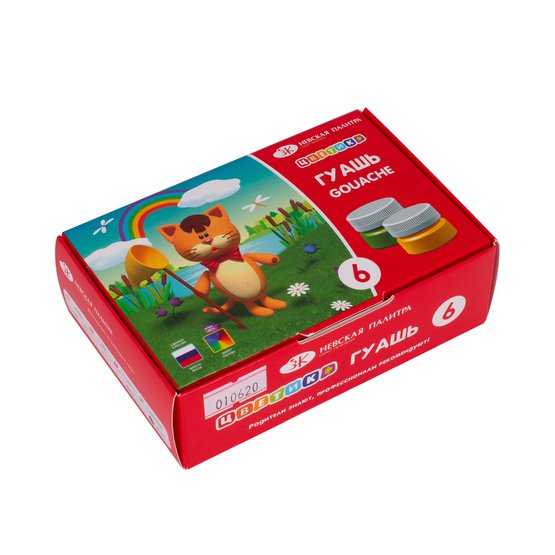 В составе набора представлены 6 классических цветов в баночках. Краски легко разводятся водой, отлично смешиваются между собой, позволяя образовывать новые оттенки. В отличие от многих других, гуашь серии Цветик почти не пахнет. Важным преимуществом краски является неизменность цвета после высыхания, что очень важно для маленьких художников. Использование производителем высококачественных связующих и пластификаторов позволяет наносить гуашевые краски в толстом слое, и после высыхания она не растрескивается, образовывая яркую матово-бархатистую поверхность. При сильном разведении водой гуашь Цветик превращается в акварель по своим свойствам ,то есть ложится полупрозрачным равномерным слоем .