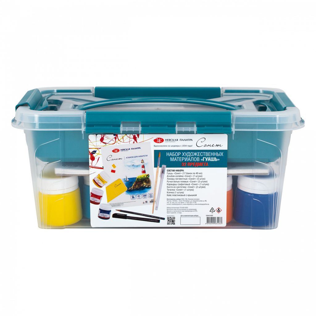 Набор художественных материалов «Сонет» "Гуашь" включает в себя все самые необходимые материалы для создания художественных работ гуашью. Набор отлично подойдет как для любителей рисования и школьников, так и для художников увлекающихся техниками работы с гуашью. Состав набора: - гуашь «Сонет» (17 банок по 40 мл), - альбом-склейка «Сонет», - линеры пигментные «Сонет» (5 штук), - ручки белые гелевые «Сонет» (3 штуки), - карандаш графитовый «Сонет» (1 штука), - кисти из синтетики «Сонет» (2 штуки), - точилка "Сонет", - клячка, - кейс пластиковый с крышкой. Размер кейса: 290х190х124 мм.