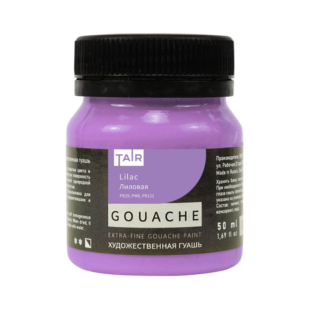 Гуашь художественная выпускается компанией «Таир», которая была основана в 1997 году в Санкт-Петербурге. Компания постоянно развивается и уже более 15 лет успешно работает на рынке художественных материалов. Гуашь производства компании «Таир» изготавливается на основе растительного клеевого состава с добавлением красящих пигментов. Применяется для живописи, декоративно-прикладного творчества, дизайнерских и оформительских работ. Краска обладает высокой степенью укрывистости, размывается водой. При высыхании приобретает бархатистый матовый оттенок. Гуашь художественная производства компании «Таир» выпускается палитрой, из 38 цветов. Предлагается в баночках по 50 миллилитров.
