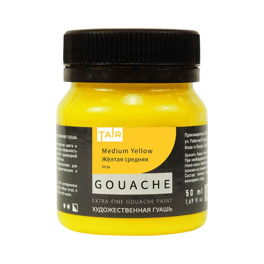 Гуашь художественная выпускается компанией «Таир», которая была основана в 1997 году в Санкт-Петербурге. Компания постоянно развивается и уже более 15 лет успешно работает на рынке художественных материалов. Гуашь производства компании «Таир» изготавливается на основе растительного клеевого состава с добавлением красящих пигментов. Применяется для живописи, декоративно-прикладного творчества, дизайнерских и оформительских работ. Краска обладает высокой степенью укрывистости, размывается водой. При высыхании приобретает бархатистый матовый оттенок. Гуашь художественная производства компании «Таир» выпускается палитрой, из 38 цветов. Предлагается в баночках по 50 миллилитров.