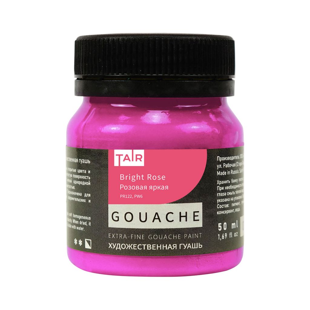 Гуашь художественная выпускается компанией «Таир», которая была основана в 1997 году в Санкт-Петербурге. Компания постоянно развивается и уже более 15 лет успешно работает на рынке художественных материалов. Гуашь производства компании «Таир» изготавливается на основе растительного клеевого состава с добавлением красящих пигментов. Применяется для живописи, декоративно-прикладного творчества, дизайнерских и оформительских работ. Краска обладает высокой степенью укрывистости, размывается водой. При высыхании приобретает бархатистый матовый оттенок. Гуашь художественная производства компании «Таир» выпускается палитрой, из 38 цветов. Предлагается в баночках по 50 миллилитров.