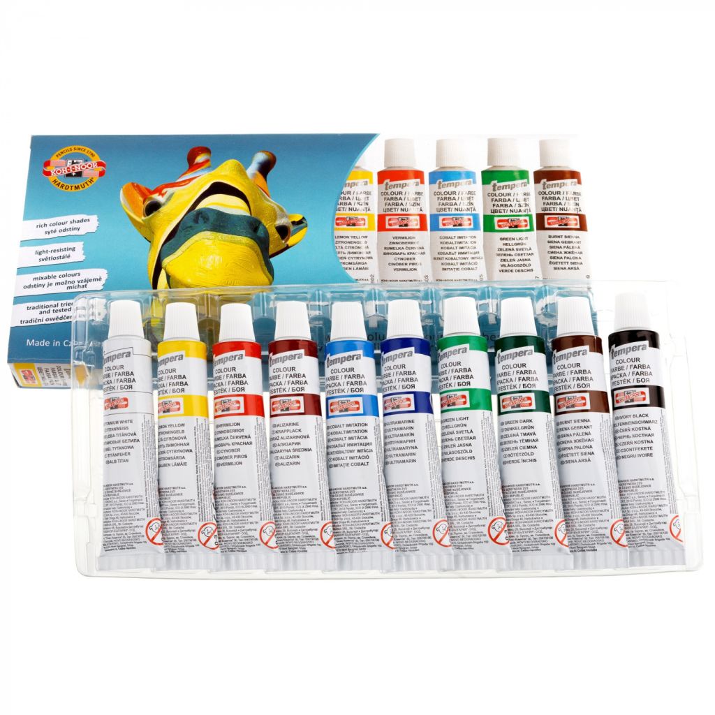 Краски Koh-i-Noor TEMPERA по своим свойствам очень похожи на гуашь. После высыхания разбавляются водой. Можно использовать как на бумаге, так и для росписи деревянных и керамических фигурок. После росписи поделок необходимо воспользоваться лаком для закрепления росписи.