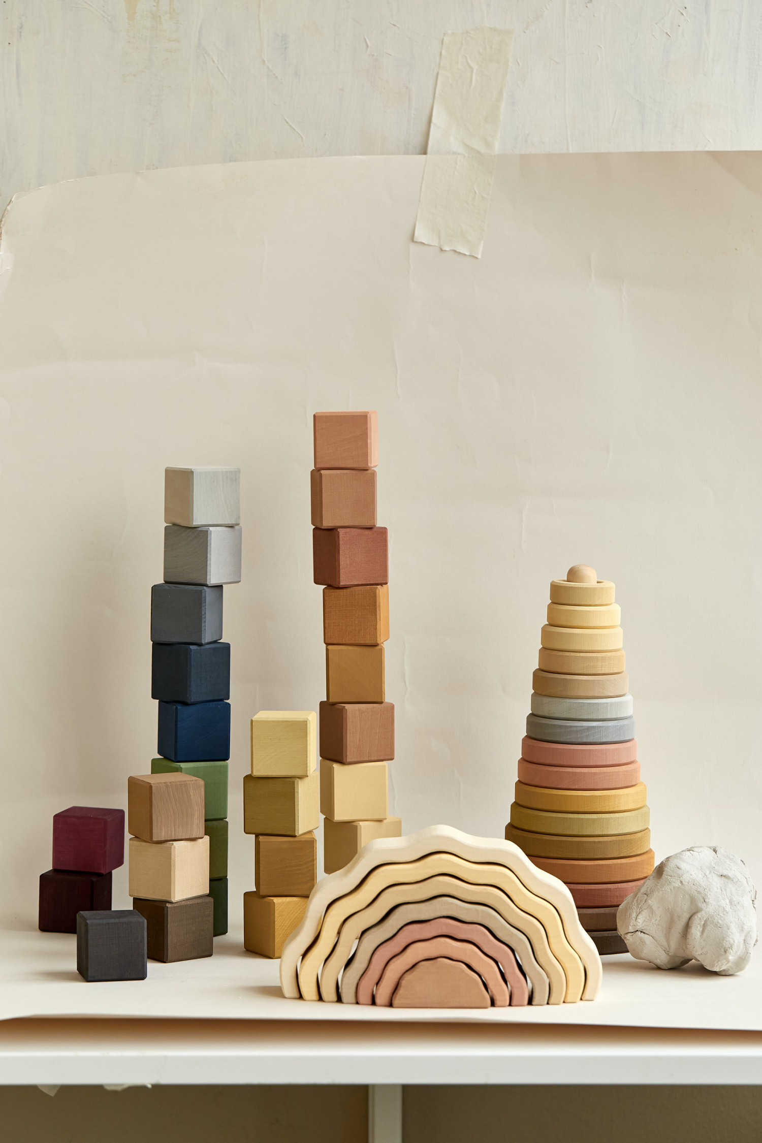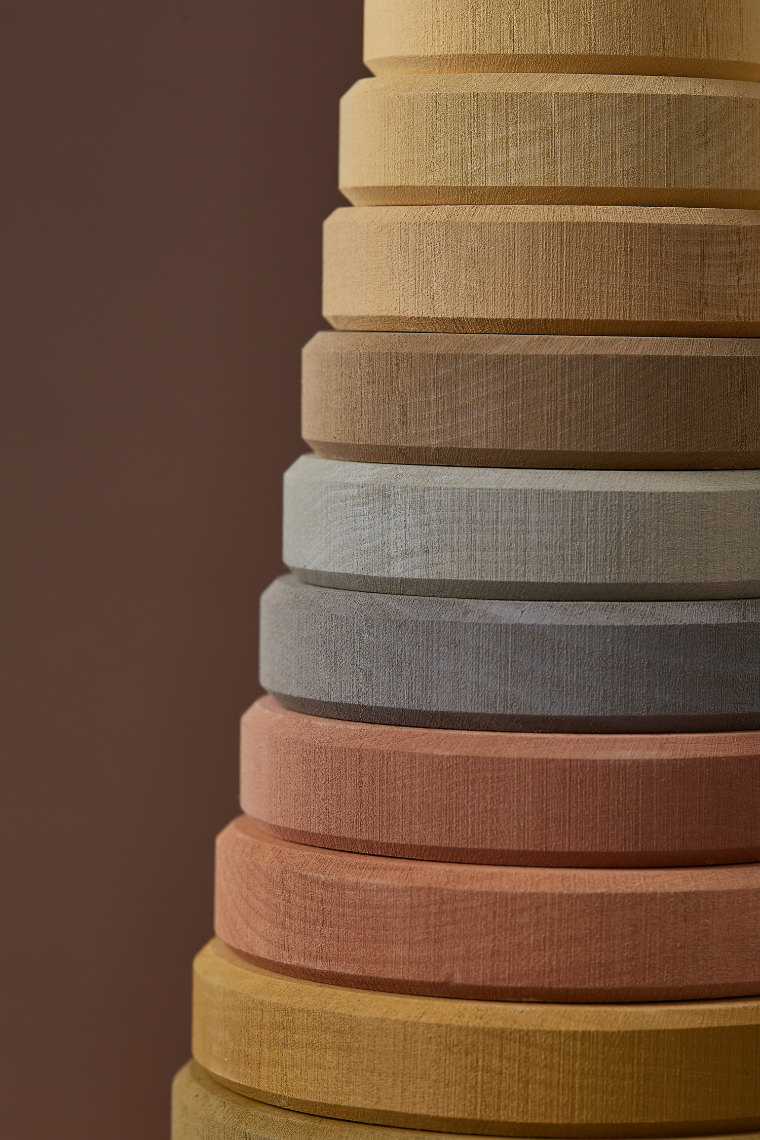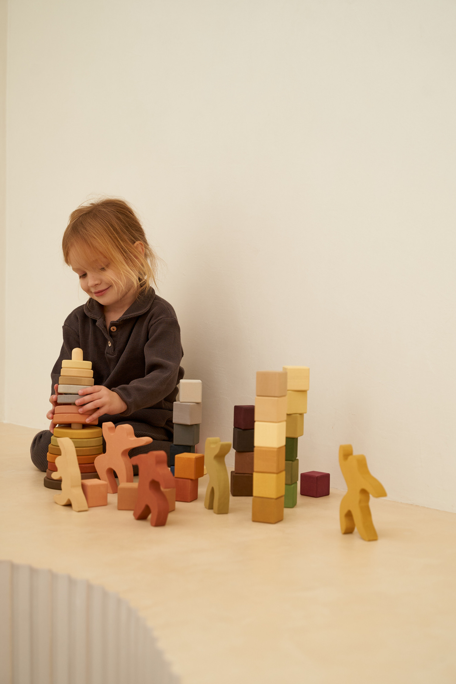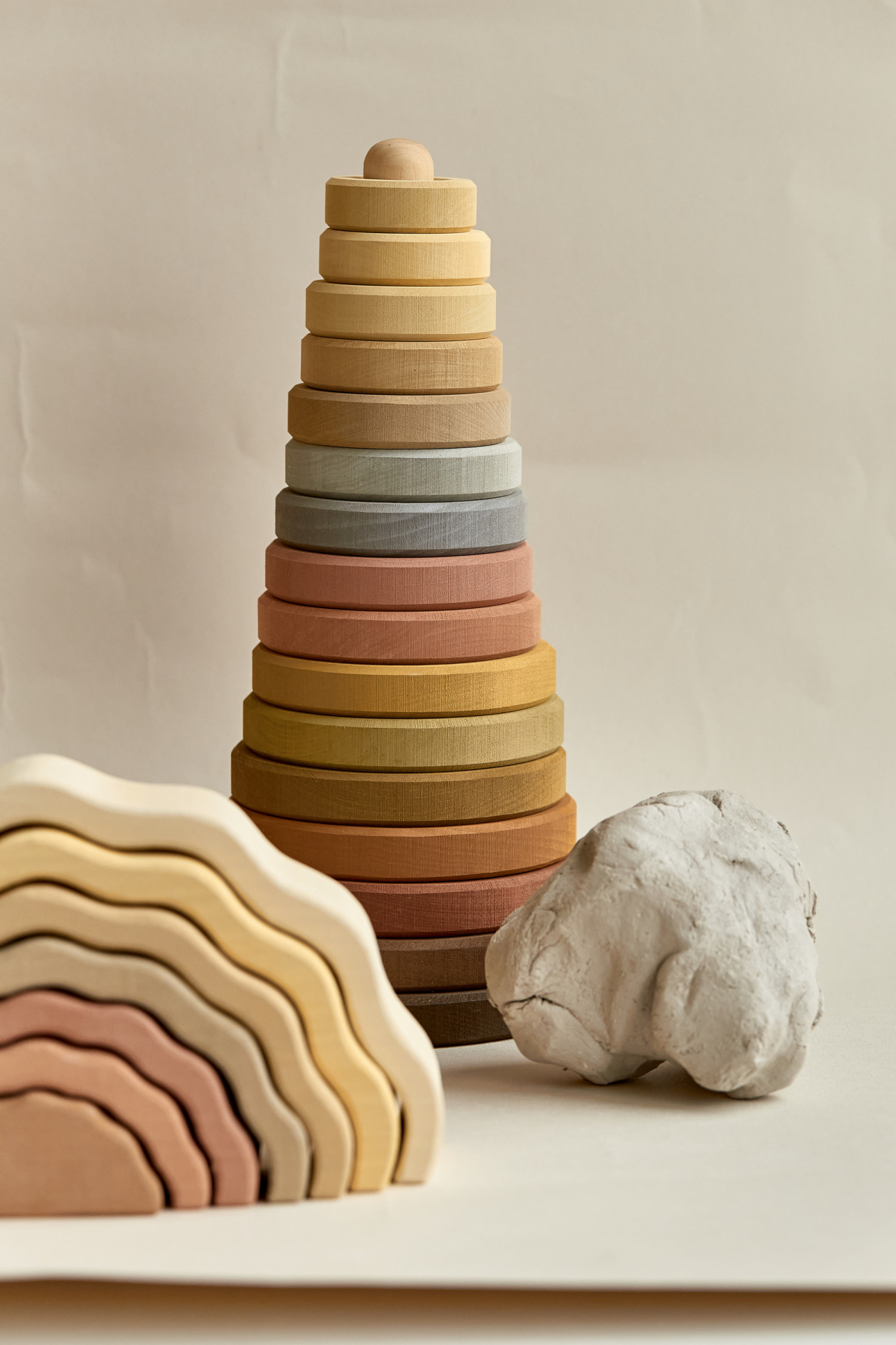 С таким большим количеством колец играть ещё интереснее. Она долго удержит внимание ребёнка. Пирамидку можно собирать правильно, аккуратно по размеру и градиенту, а можно перевернуть и собрать в форме торнадо, а можно вообще хаотично. Ваш ребёнок сам определяет правила игры. В пирамидке 16 колец и ни один из оттенков не повторяется. RADUGA GR?Z сохранили рисунок дерева и окрасили кольца в натуральные спокойные оттенки бежевого, серого, розового, зелёного и коричневого. Цвета колец похожи на глину, мелки, шёлковые ленты. Насаживать эти колечки теперь ещё легче, потому что отверстия в кольцах мы сделали чуть больше чем обычно, а сам штырь для безопасности закруглили. Классическая пирамидка – игрушка, которая есть почти у всех детей, и пусть она будет без компромиссов: однозначно красивая и интересная. Как играть: Складывайте фигуры на плоской поверхности, например, длинную гусеницу или снеговика. Найдите на улице ветку дерева и украсьте её кольцами. Прокатите диски по наклонной плоскости. Нанизывайте кольца на ленту, учитесь считать. Собирайте и разбирайте с закрытыми глазами. Постройте дорожку из колец от одной куклы к другой, представьте, что кукла идёт в и к своим друзьям. Создавайте ожерелья, нанизывая кольца на ленту.