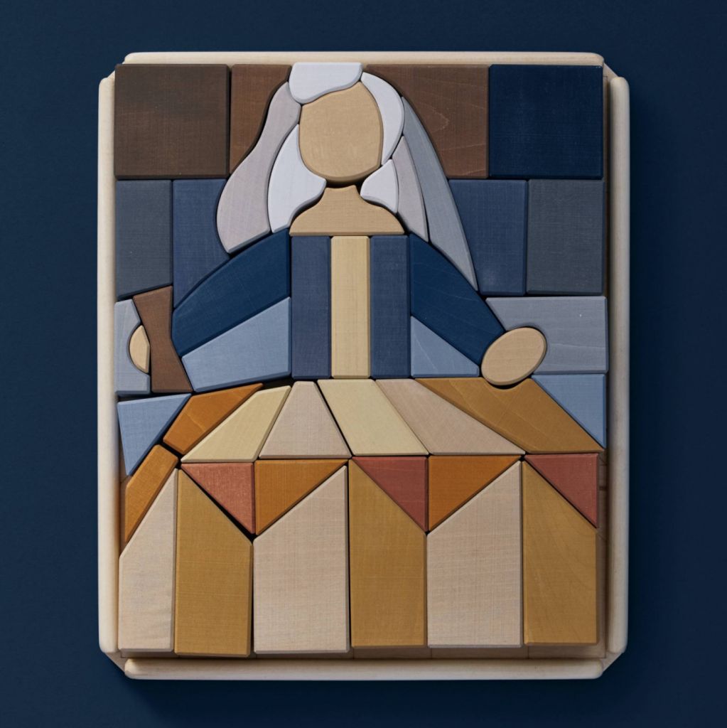 Конструктор вдохновлён картиной Веласкеса Менины и переработкой этой картины Пикассо. Из-за геометричности деталей из него отлично получаются постройки домов, небоскрёбов, церквей, лодок, городов, улиц. Сделан в красивых глубоких цветах: синий, коричневый, бежевый, серый, глиняный. Чтобы родителю не было больно случайно наступить на игрушку, мы вручную убрали острые углы с каждого детальки. А чтобы детям было удобнее строить и кубики не раскалывались, мы не покрываем игрушки лаком. Выпилены и покрашены вручную в России в маленькой семейной мастерской. Как играть: Обсудить картину Веласкеса “Менины”. Построить из деталей город XVII века. Строить по очереди, добавляя по одной детали. Составить конструкцию и нарисовать её.