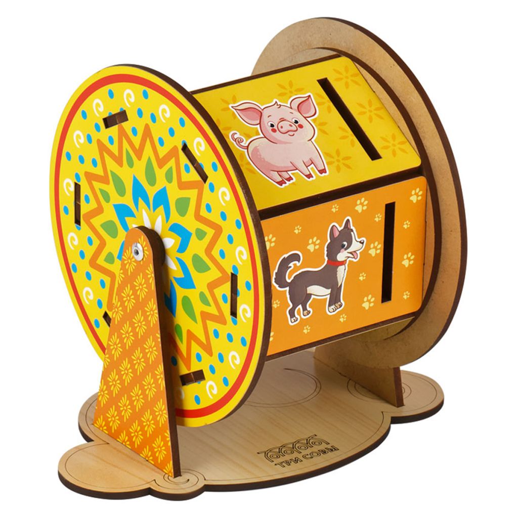 Развивающая игрушка сортер-барабан «Кто чем питается?» бренда «ТРИ СОВЫ» знакомит ребенка с жизнью домашних животных. Малышу предстоит правильно «накормить» животных, изображенных на сортере. Для этого необходимо выбрать фигуру с подходящим изображением и пропустить ее в прорезь на барабане. Также барабан можно крутить и наблюдать красочный калейдоскоп меняющихся изображений. Игрушка выполнена из ДВП высокой плотности, металла и бумаги. Размер – 14,5*12*13,5 см.