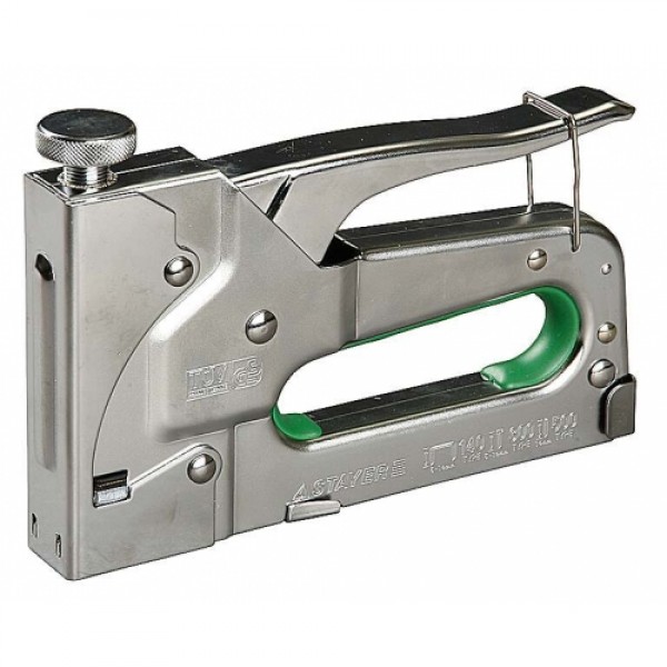 Пистолет Stayer Master скобозабивной 4в1. Тип 140. Допустимый размер скоб: 6-14 мм. Предназначен для крепления материалов к различным поверхностям при помощи скоб, гвоздей и штифтов. Корпус пистолета изготовлен металла, имеет усиленную конструкцию. Механизм приводится в действие благодаря спуску пластинчатой пружины. Также возможна регулировка ударной силы пистолета, что удобно при работе с различными материалами.