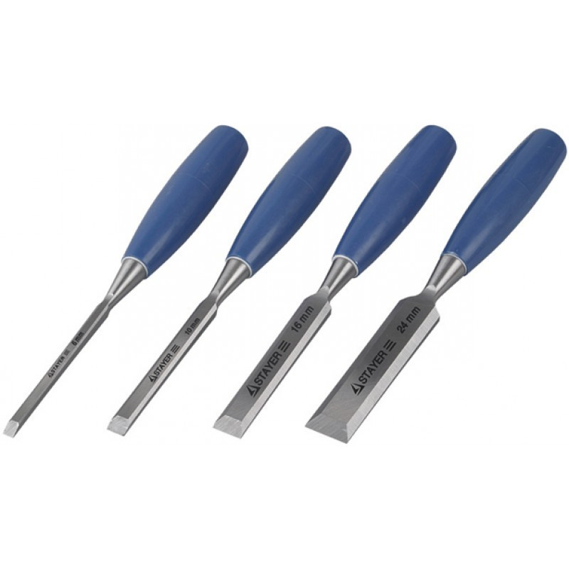 Набор STAYER Стамески "MASTER" плоские с пластмассовой ручкой, 6/12/18/25, 4 шт – это 4 стамески, которые используются для строгания, выборки отверстий и углублений в древесине мягких или твердых пород дерева. Размер стамесок 6 мм, 12 мм, 18 мм, 25 мм.