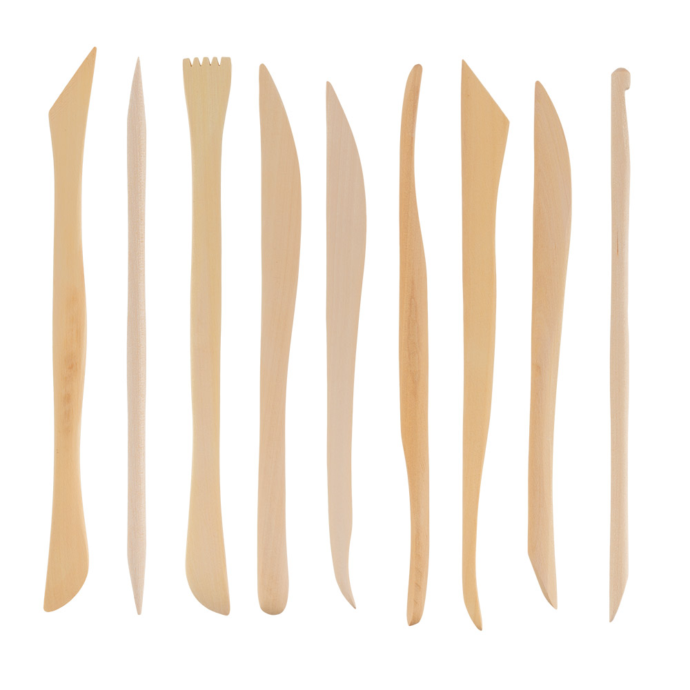В наборе 9 деревянных стеков различной формы. Стеки предназначены для работы с глиной, пластилином и прочими материалами для лепки, могут использоваться в живописи для нанесения краски в пастозной технике или для создания барельефов и основ для творчества.