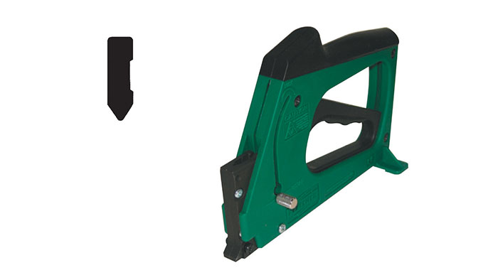 Пистолет с механическим приводом " FLEXIMASTER" (США) зеленого цвета. К нему подходят только гибкие стрелки черного цвета "Fletcher F-T" длиной 15 мм и толщиной 0.41мм. Для разборки рамы достаточно отогнуть стрелки. Пистолет используют для сборки выставочных, а также фотографических рам в небольших количествах.