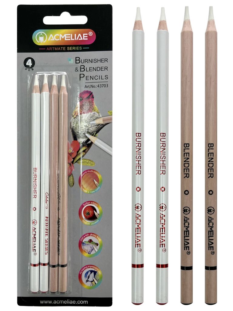 Набор специализированных карандашей для корректировки графических работ. Полирующий карандаш ACMELIAE – бесцветный карандаш из воска, расширяющий художественные возможности цветных карандашей. Это профессиональный инструмент, используемый для полировки и придания спецэффектов. При нанесении карандаша для полировки поверх основного рисунка, сделанного цветными карандашами, он «соединяет» краситель с бумагой, умешает зернистость, и рисунок становится более ярким, блестящим и глянцевым, а цвет ровным. Карандаш – полировщик защищает от смешивания цветов и используется для интересных спецэффектов, особенно часто в анималисте при прорисовке шерсти. Подходит для «обратной» техники: если сначала провести линии карандашом-полировщиком ACMELIAE, а поверх него цветным – то из-под цвета будут проступать нанесённые линии. Карандаш-блендер ACMELIAE равномерно смешивает цвета, делает естественными цветовые переходы, убирает зернистость, смягчает и придаёт однородность текстуре. Позволяет получать новые оттенки и цвета. Это достигается путем нанесения карандаша-блендера поверх основного цвета. В результате, выполненный рисунок, смотрится более гармонично. Подходят для скетчинга, эскизов, набросков, графики, портретов, живописи. Рекомендуются начинающим и профессиональным художникам, детям, школьникам, любителям творчества. Для студий и художественных школ. Корпус из натуральной древесины. Затачиваются точилкой.