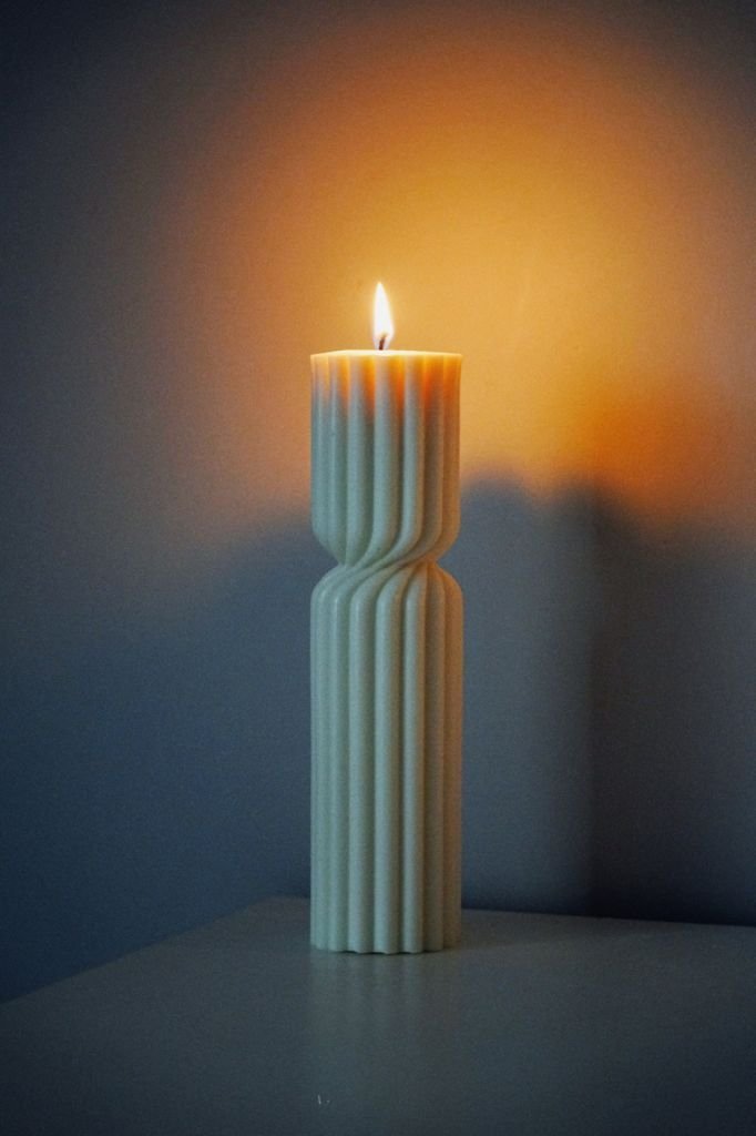 Интерьерная свеча из натурального соевого воска. Выпускается в размерах 15 см и 24 см. Форма свечи передает идею потока: мыслей, идей, вдохновения. Она станет отличным украшением дома или творческой студии. Хлопковый фитиль, высота свечи 24 см. Перед зажиганием поставьте свечу на подставку, блюдце или бумагу, чтобы не испачкать вашу мебель (воск легко удалить горячей водой). Перед каждым повторным зажиганием свечи немного подрезайте сгоревший фитиль.