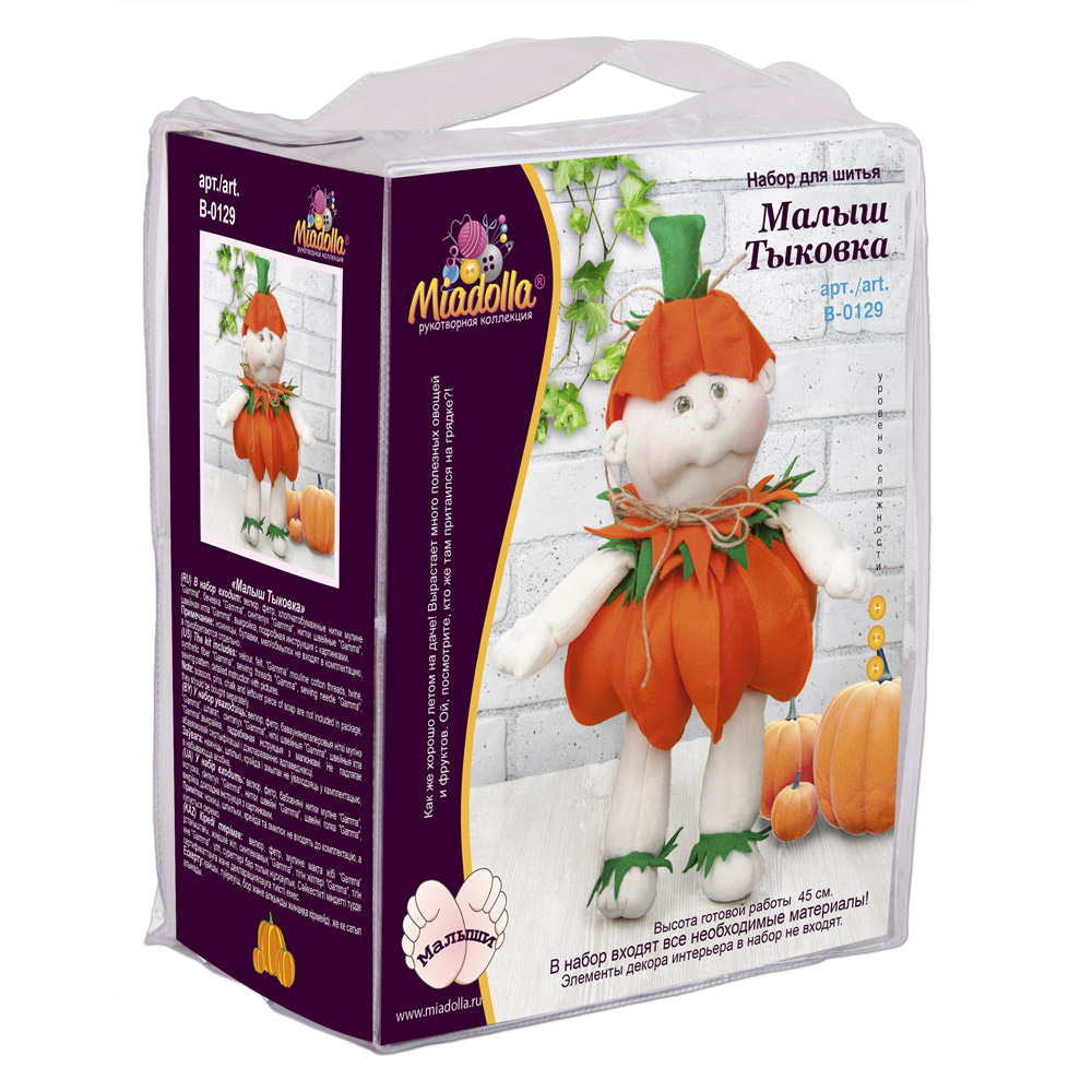Создание мягкой игрушки своими руками — это не просто шитьё, а увлекательный процесс, который придется по душе и взрослым и детям. Только представьте, вы сами создаёте то, что будет долгие годы украшать ваш интерьер или радовать ваших детей в процессе игры. Кроме того, ваша игрушка будет на 100% уникальной, потому что никто больше не повторит каждый стежок сделанный вами. В наборе есть всё самое необходимое для изготовления игрушки, вам остаётся только уделить немного времени и вложить капельку тепла и души в этот медитационный творческий процесс созидания. Как же хорошо на даче отдыхать! Да и помочь бы бабушке на грядках не мешало. А кто это притаился под листиком? Это же малыш Тыковка! Какой плодородный нынче урожай. Состав набора: Бечевка "Gamma", Велюр, Выкройка, Нитки мулине "Gamma", Нитки швейные "Gamma", Подробная инструкция с картинками, Синтепух "Gamma", Фетр, Швейная игла "Gamma". Высота игрушки: 45 см.