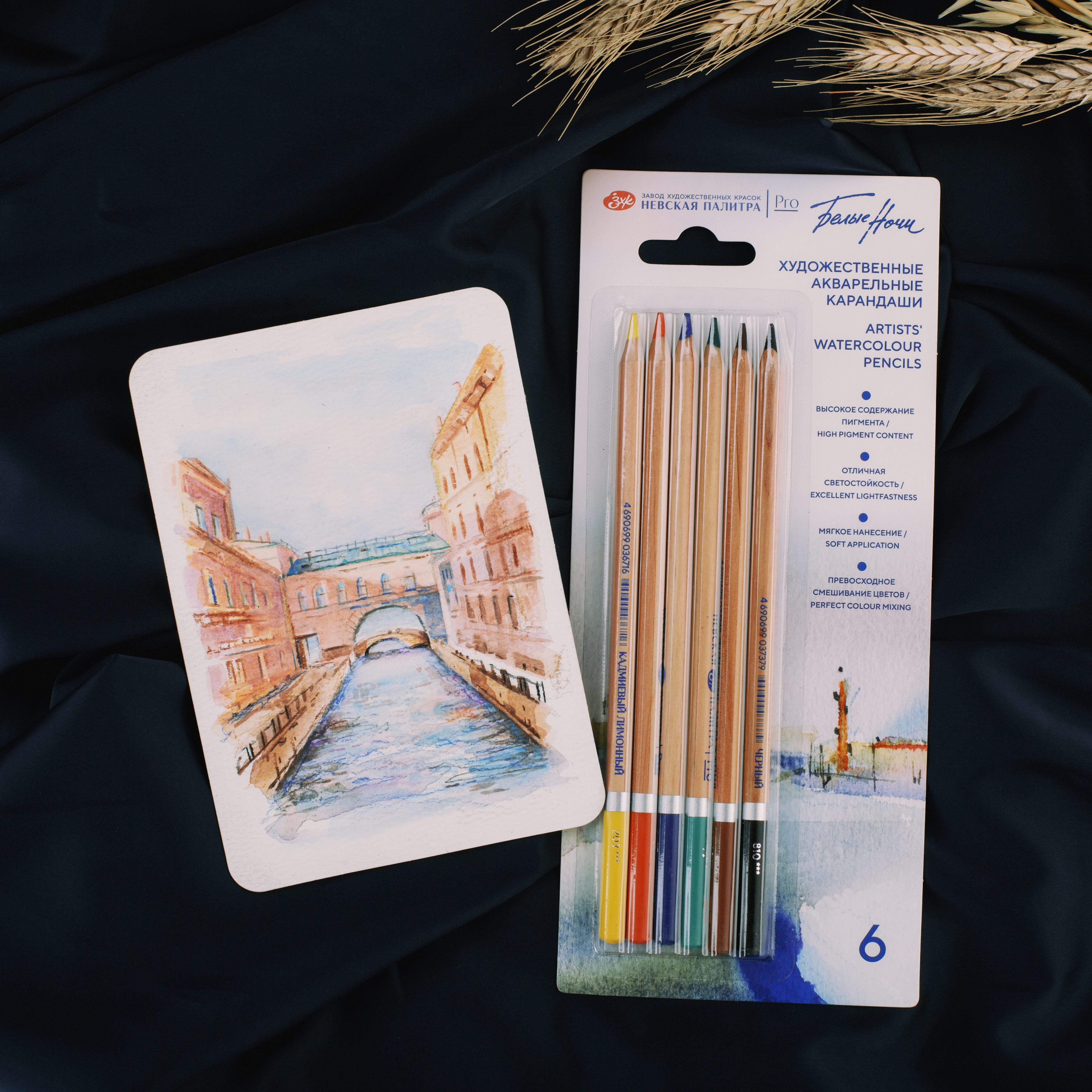 Акварельные карандаши «Белые ночи» разработаны специально для художников, дизайнеров и иллюстраторов. Совмещают преимущества цветных карандашей и акварельных красок. Позволяют добиваться графической точности и реалистичной детализации изображений, а при добавлении воды получать нежные акварельные работы. Также подходят для смешанных техник и различных эффектов. Благодаря высокой концентрации и тончайшему перетиру пигментов обладают яркими насыщенными цветами, бархатной мягкостью нанесения штриха и превосходной растворимостью. Смешение цветов как в сухом, так и во влажном состоянии дает новые чистые оттенки и плавные цветовые переходы. Состав набора: кадмиевый лимонный 203, кадмиевый красный светлый 313, ультрамарин 511, зеленый 725, умбра жженая 408, черный 810.