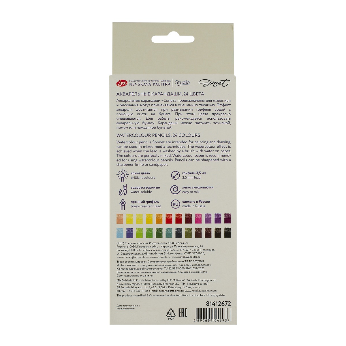 Акварельные карандаши “Сонет” предназначены для живописи и рисования, могут применяться в смешанных техниках, имеют целый ряд достоинств: - яркие, насыщенные цвета; - превосходная размываемость (не оставляя следа от штриха); - высокая укрывистость красочного слоя; - превосходно смешиваются цвета; - грифель не нарушает целостность рабочего листа даже при сильном нажатии; - деревянный корпус выполнен из гипоаллергенной древесины (липа мелколистная); - упаковка снабжена интуитивно понятным “язычком”, облегчающими открывание упаковки Рекомендации: Для работы акварельными карандашами рекомендуем использовать бумагу для акварели. Сухой штрих, нарисованный акварельным карандашом, стирается сложно. Чтобы не испортить бумагу, линию немного затирают ластиком-клячкой, а затем размывают водой до полного исчезновения цвета и ждут высыхания бумаги. Можно выполнить рисунок и без размытия. В этом случае он будет отличаться более яркими цветами, чем при использовании обычных цветных карандашей. Перед первым использованием рекомендуется слегка заточить карандаши, чтобы обеспечить гладкое и аккуратное нанесение, избегая царапин на бумаге. Это необходимо из-за возможного производственного налёта и защитного покрытия на грифеле карандашей.