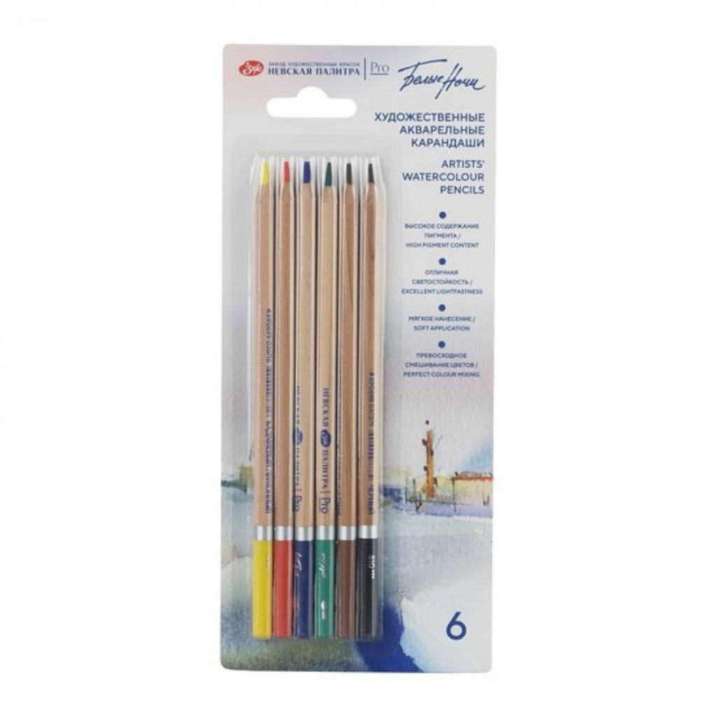 Акварельные карандаши «Белые ночи» разработаны специально для художников, дизайнеров и иллюстраторов. Совмещают преимущества цветных карандашей и акварельных красок. Позволяют добиваться графической точности и реалистичной детализации изображений, а при добавлении воды получать нежные акварельные работы. Также подходят для смешанных техник и различных эффектов. Благодаря высокой концентрации и тончайшему перетиру пигментов обладают яркими насыщенными цветами, бархатной мягкостью нанесения штриха и превосходной растворимостью. Смешение цветов как в сухом, так и во влажном состоянии дает новые чистые оттенки и плавные цветовые переходы. Состав набора: кадмиевый лимонный 203, кадмиевый красный светлый 313, ультрамарин 511, зеленый 725, умбра жженая 408, черный 810.